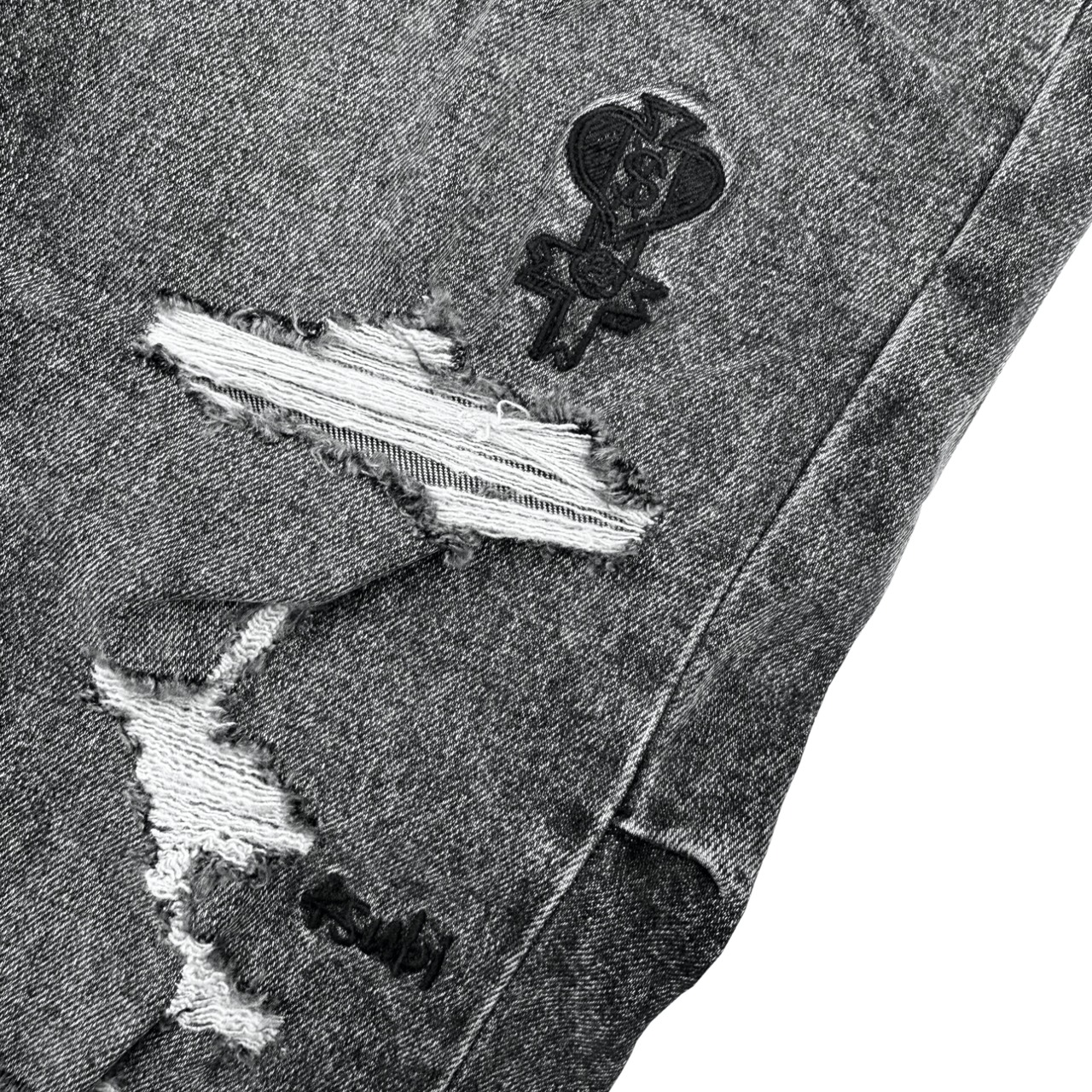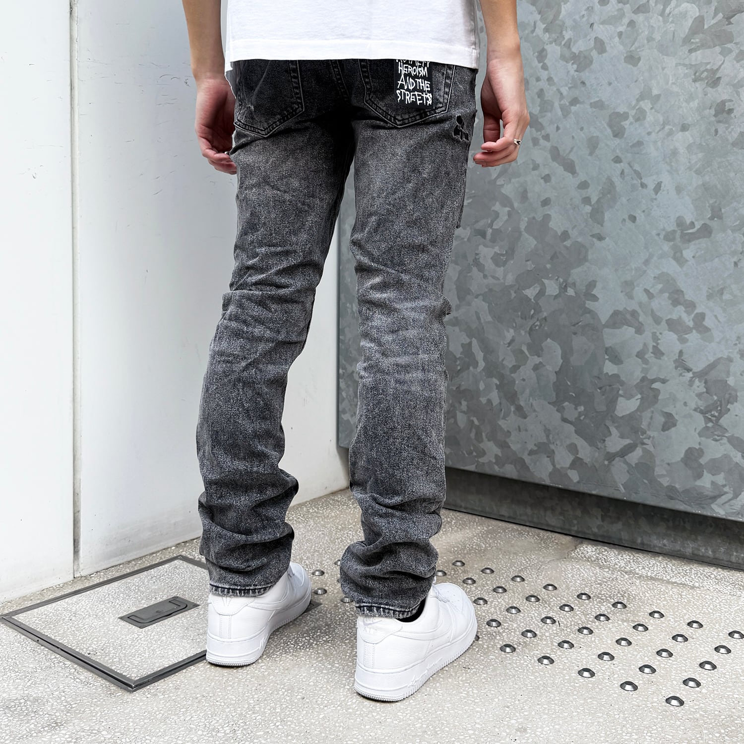 全面にダメージ加工、後ろポケットにシグネチャー織りタグ。