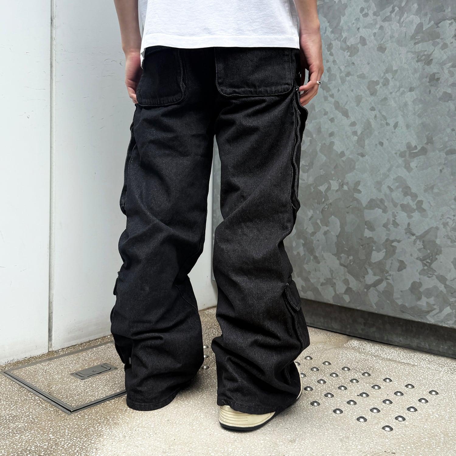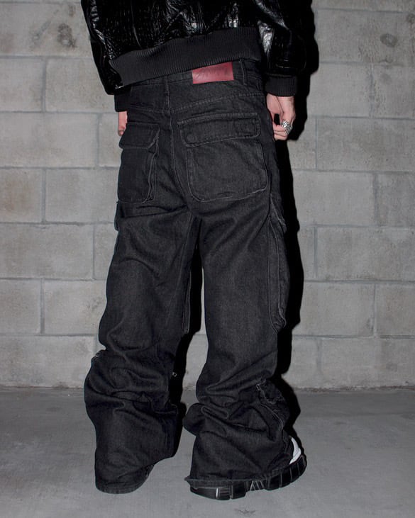 デニム生地が使用されたバギーシルエットのカーゴパンツ。