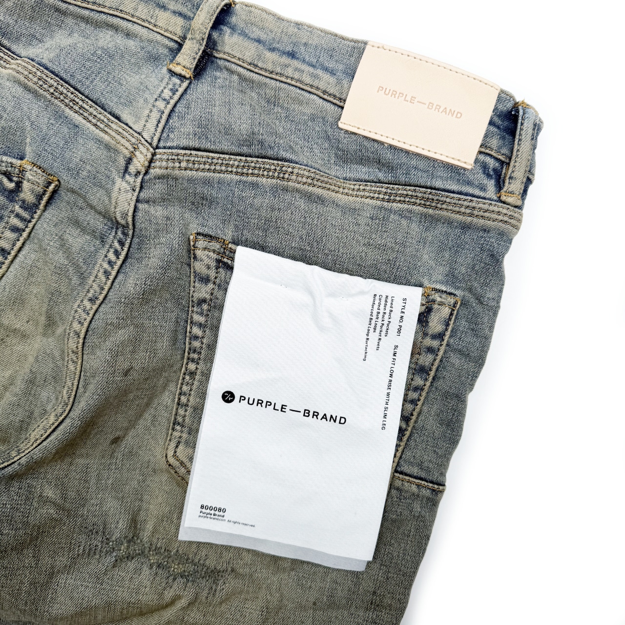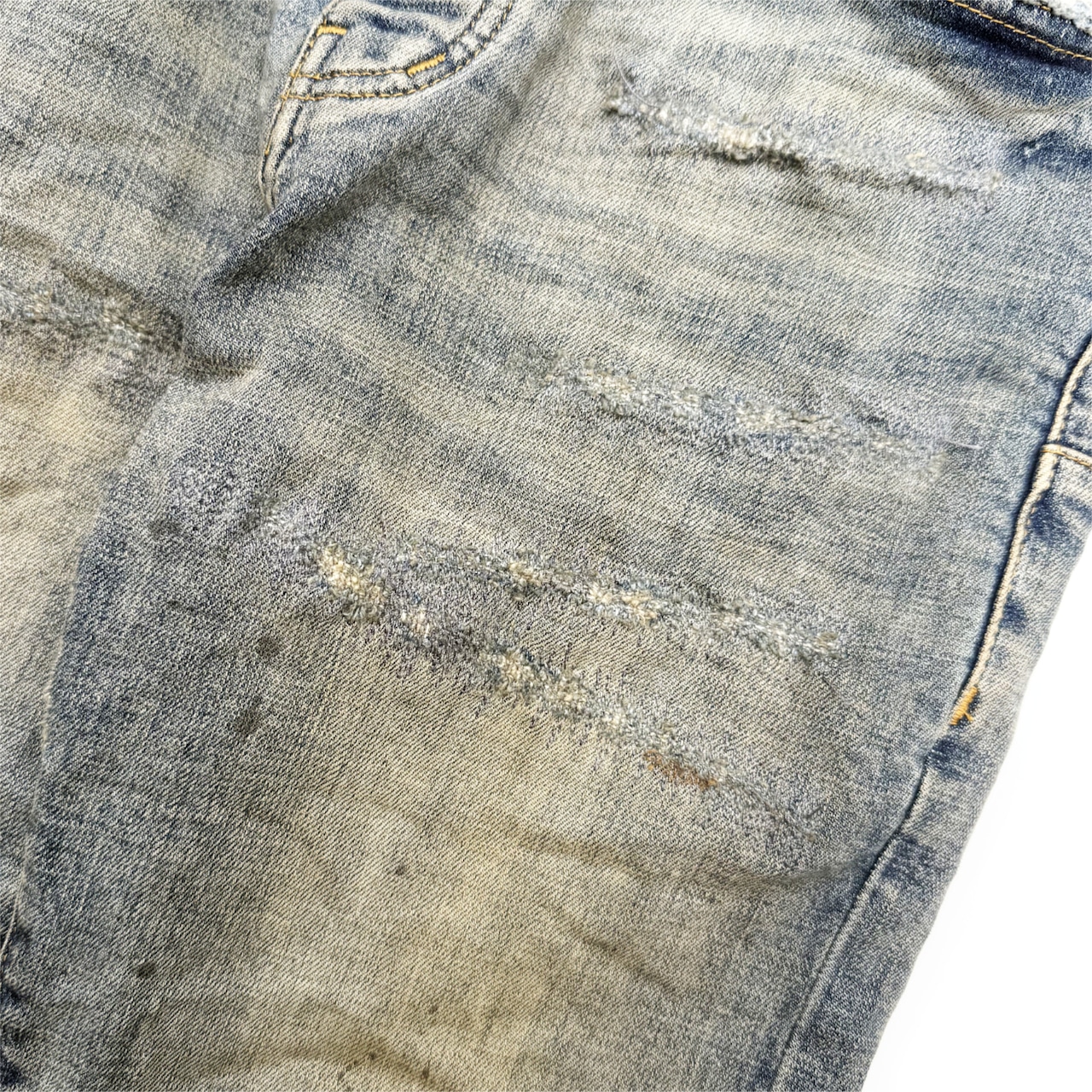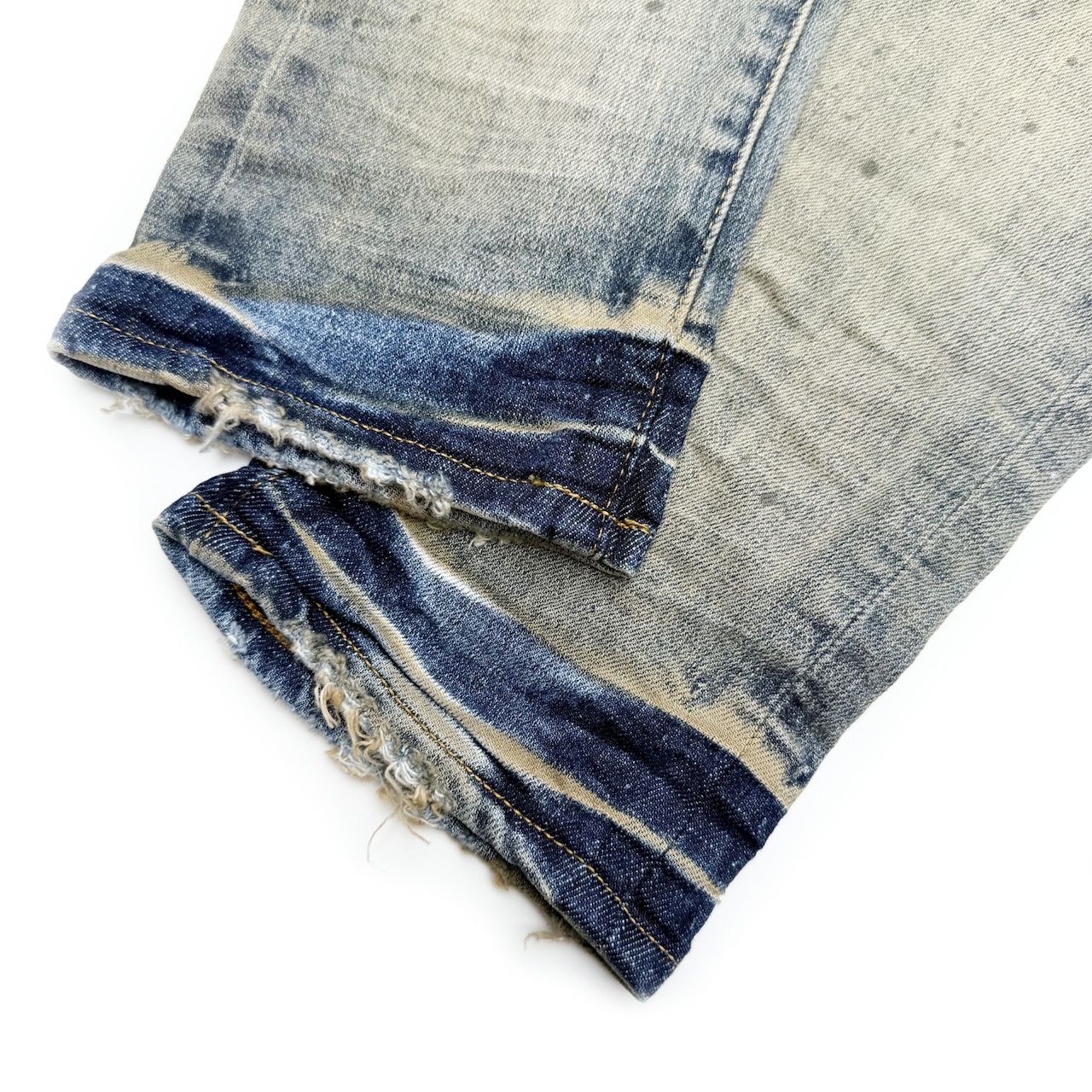 全面にダメージ加工と3Dシワ加工、1点1点手作業によるウォッシュ加工、後ろポケットにブランドの織りタグ。