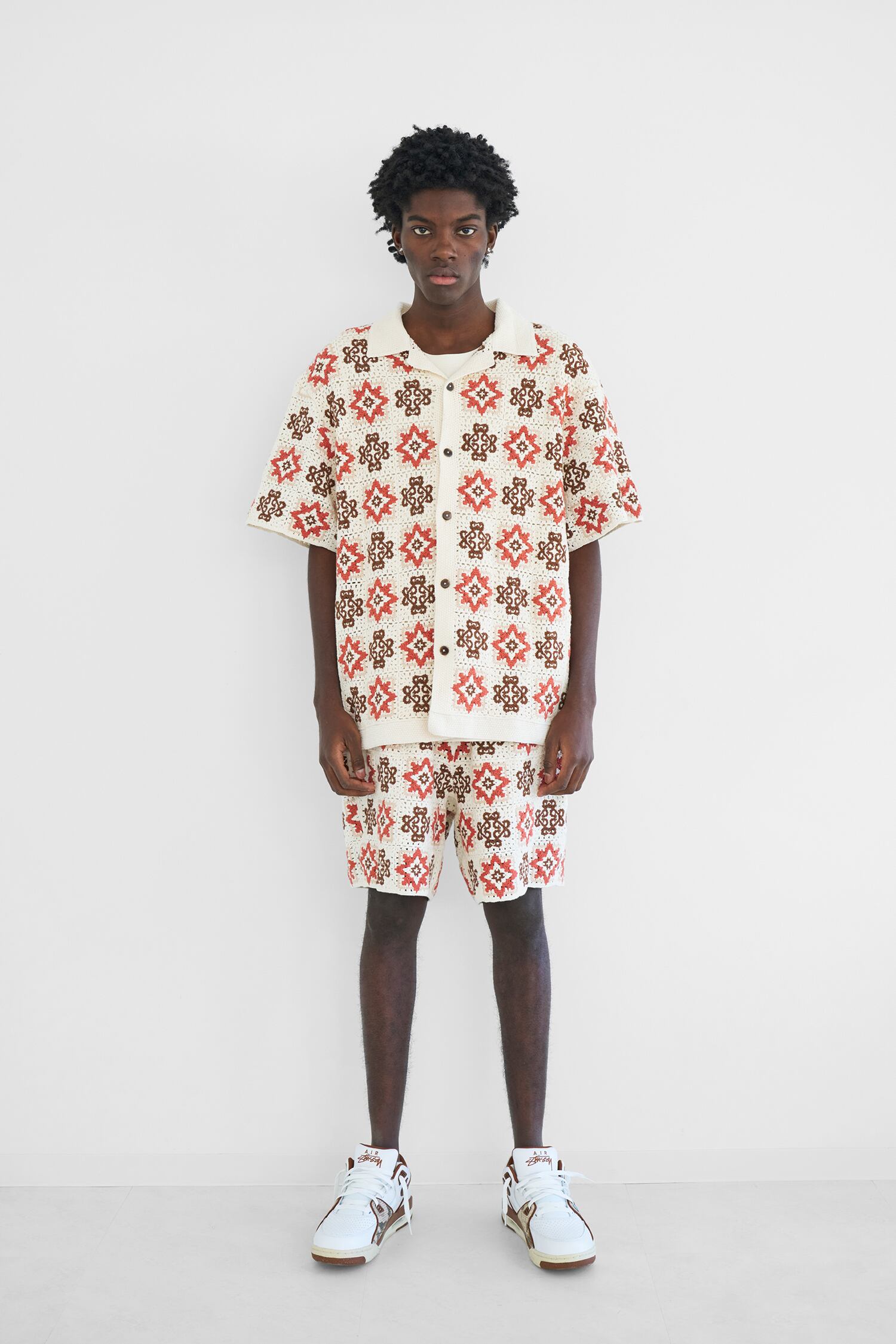 オリジナル柄をブロック状に配置した、クロシェ編みのシャツです。