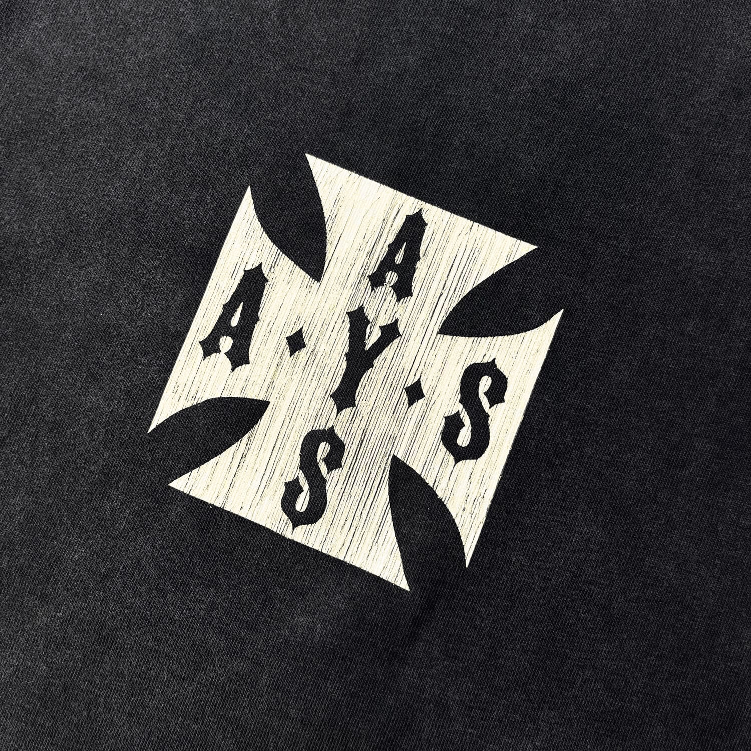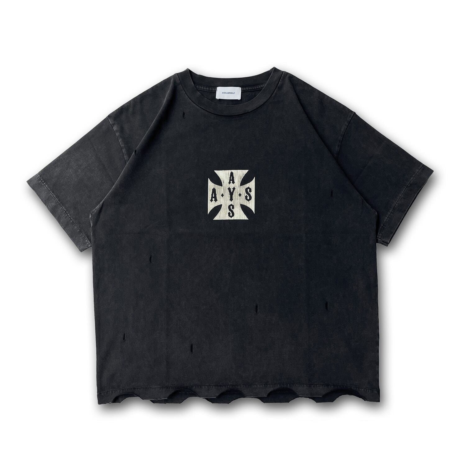 フロントにヴィンテージの経年劣化を表現する技法のプリントでクロスのデザインが落とし込まれております。