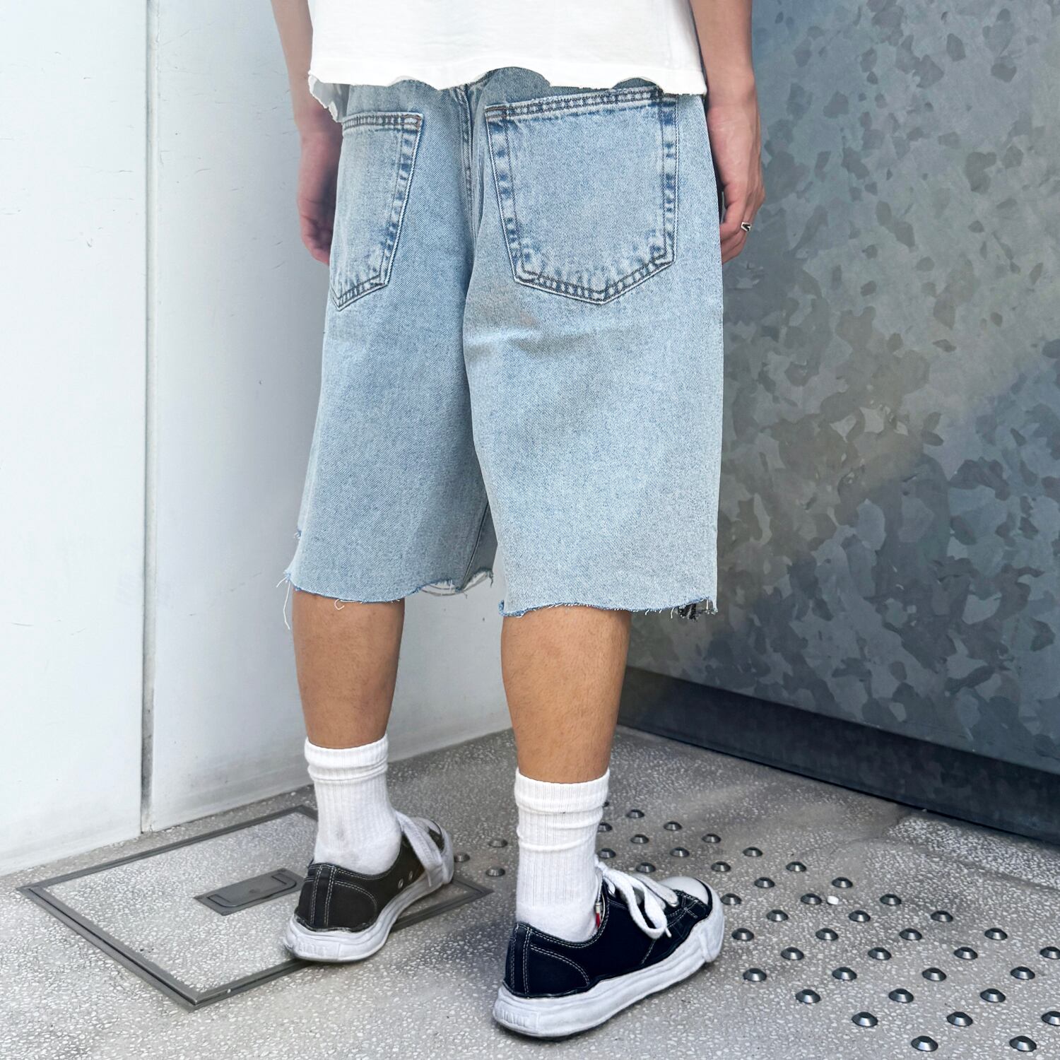 ヴィンテージのウォッシュ加工が施されたバギーシルエットのデニムショーツ。