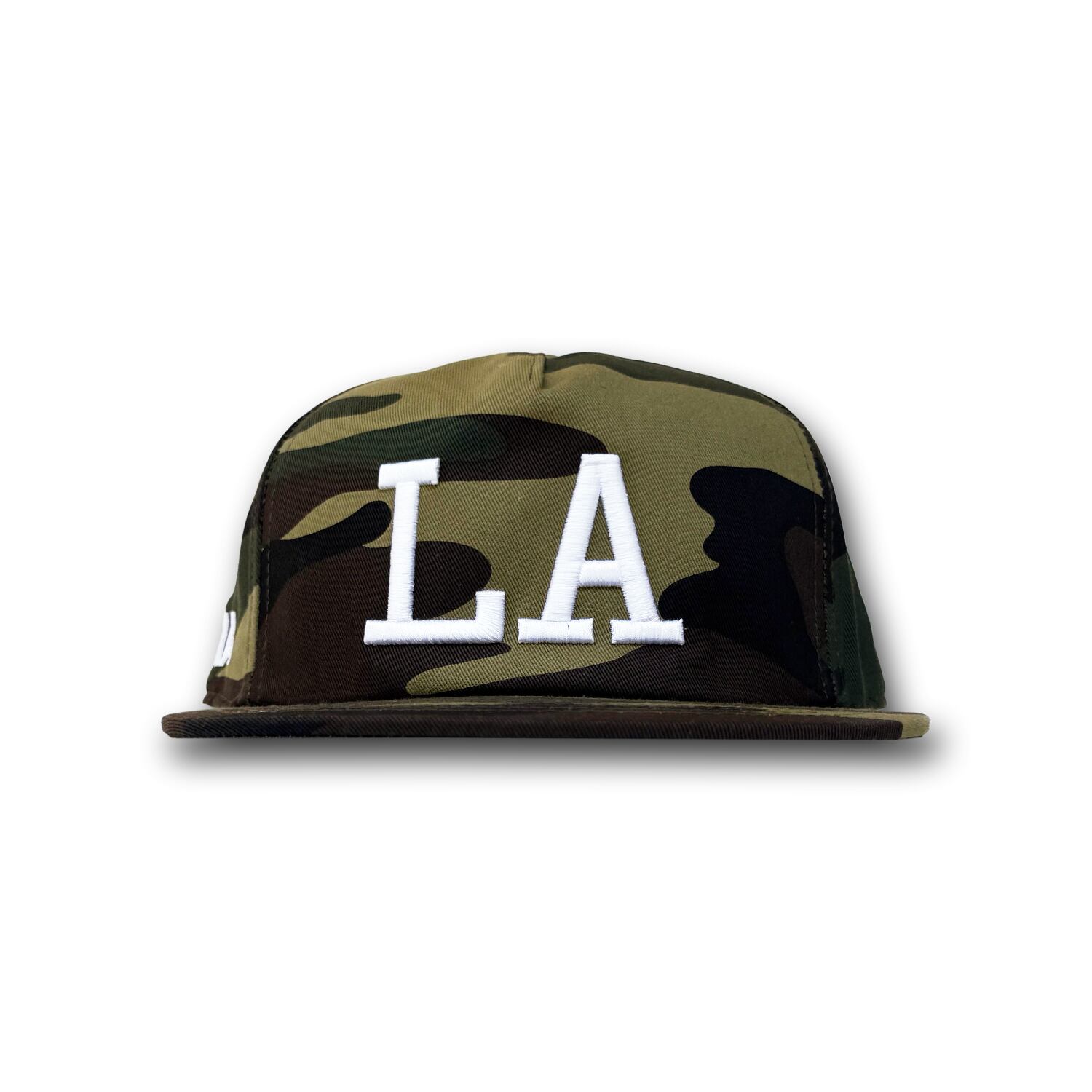 フロントにLAの3D刺繍が落とし込まれた5パネルキャップ。