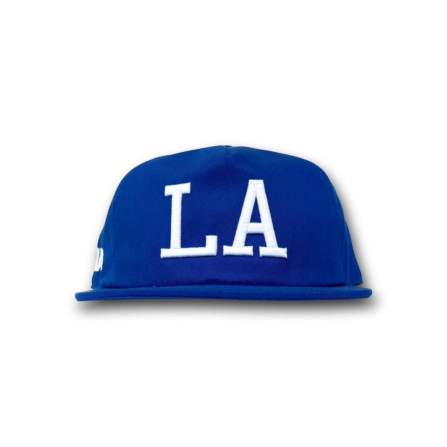 フロントにLAの3D刺繍が落とし込まれた5パネルキャップ。