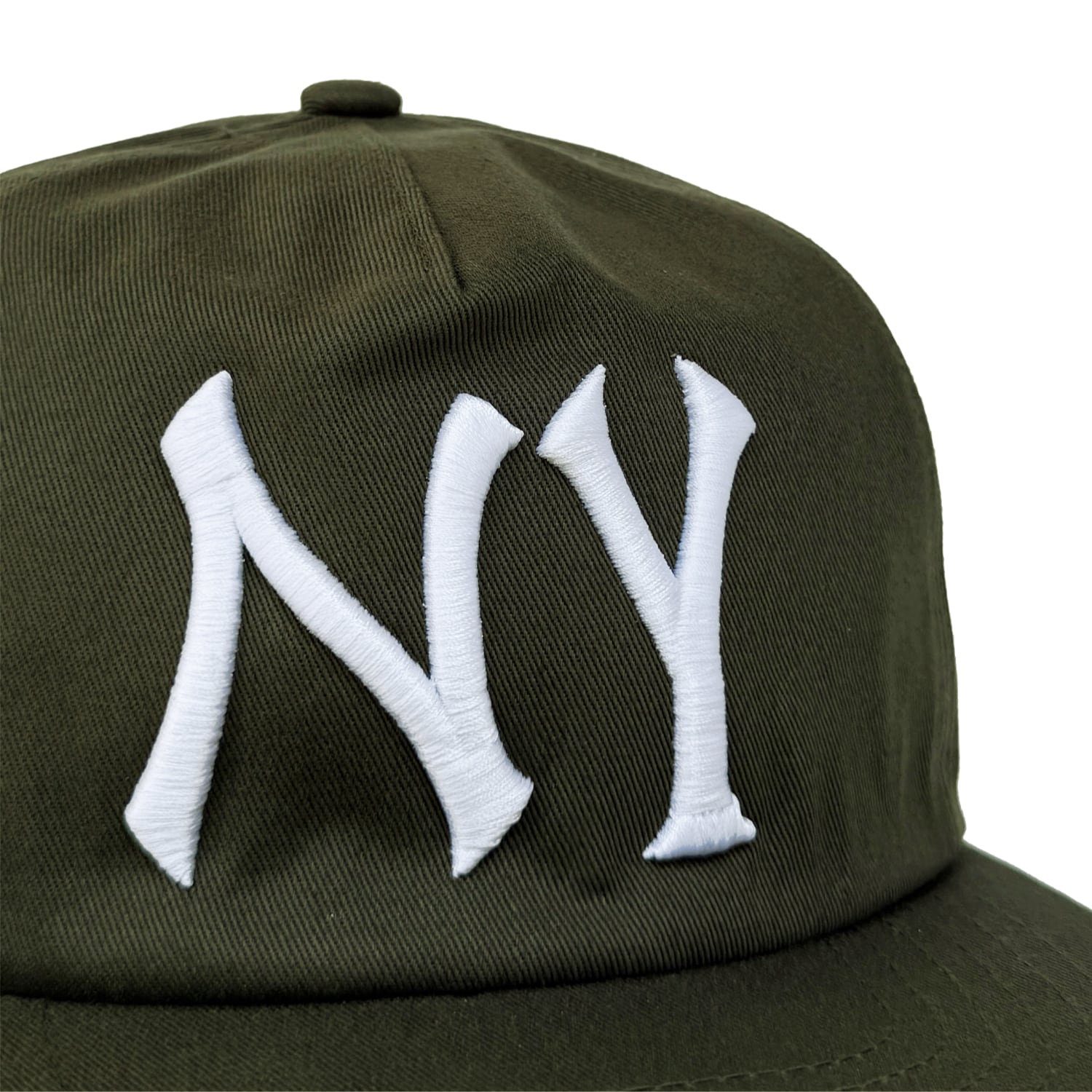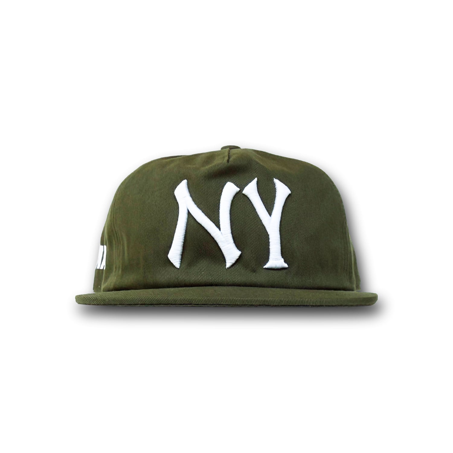 フロントにNYの3D刺繍が落とし込まれた5パネルキャップ。
