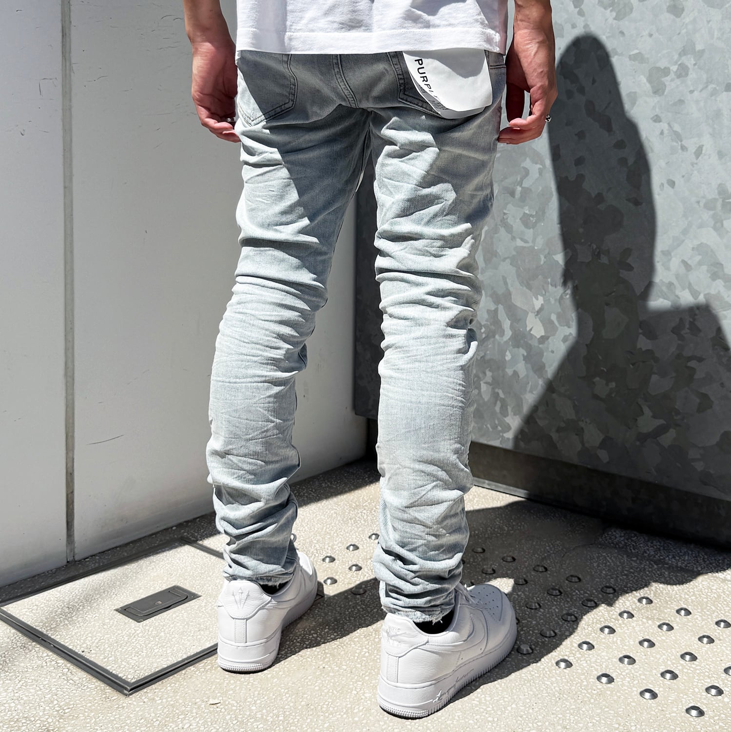 フロントにダメージ加工と細かいタタキ加工が施されたスキニーデニム。