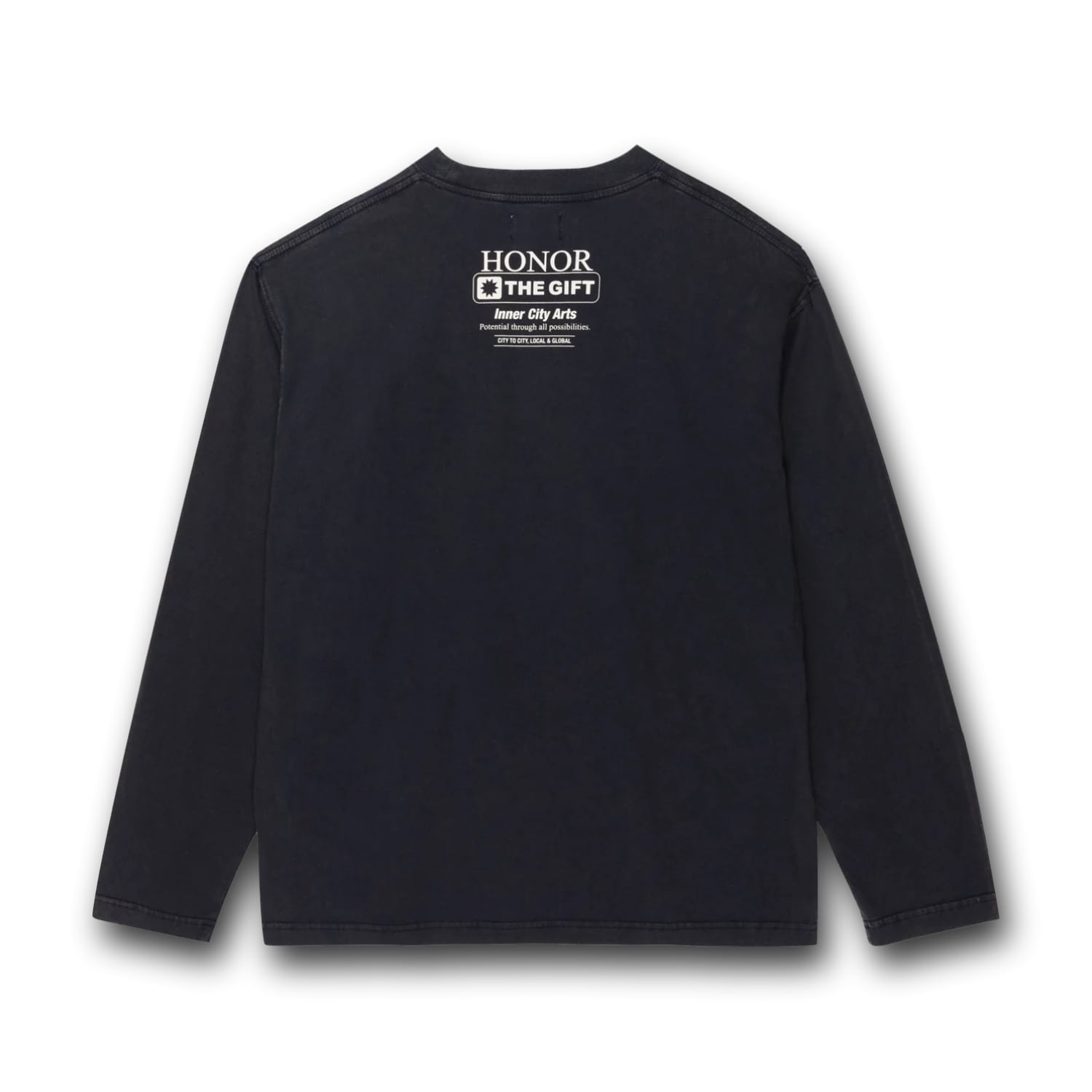 ウォッシュ加工が施されたロングスリーブTシャツ。