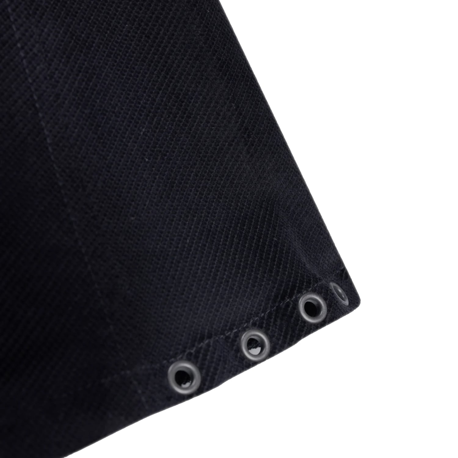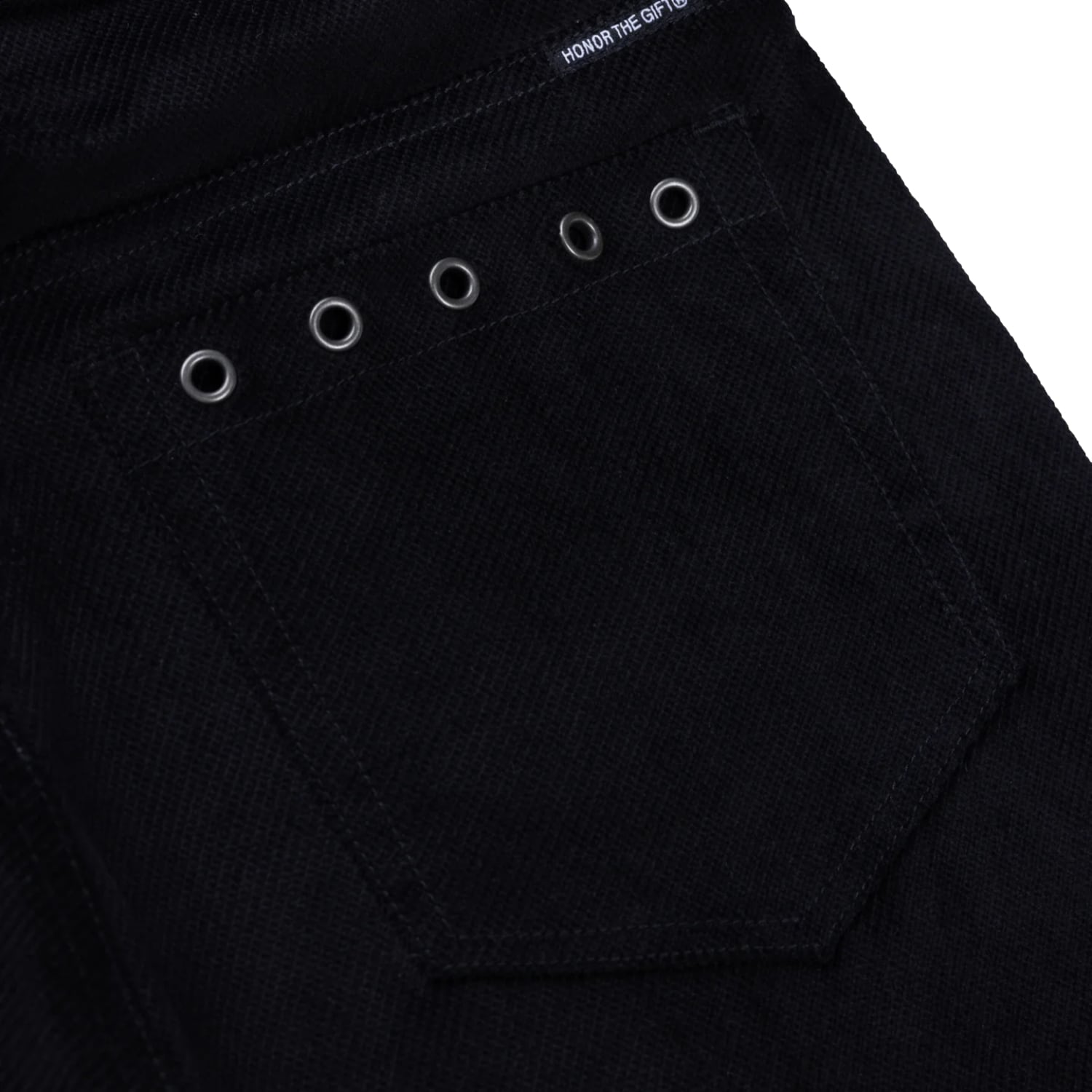 フロントとバックのポケットと裾はアイレットにカスタムされており、左膝部分には刺繍デザインが落とし込まれております。