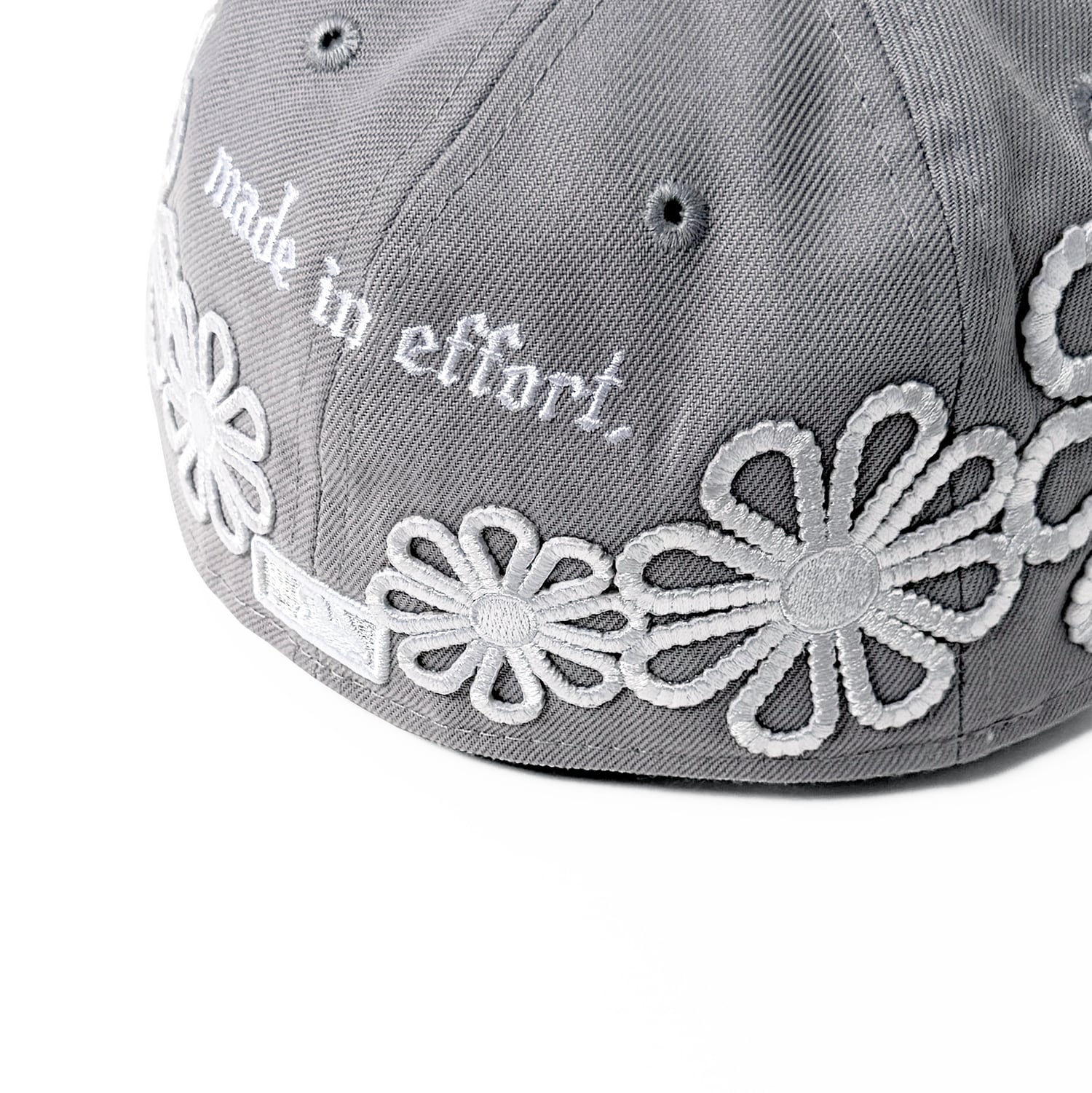 サイドとバックにフラワーデザインの刺繍パッチが施されたカスタムキャップ。