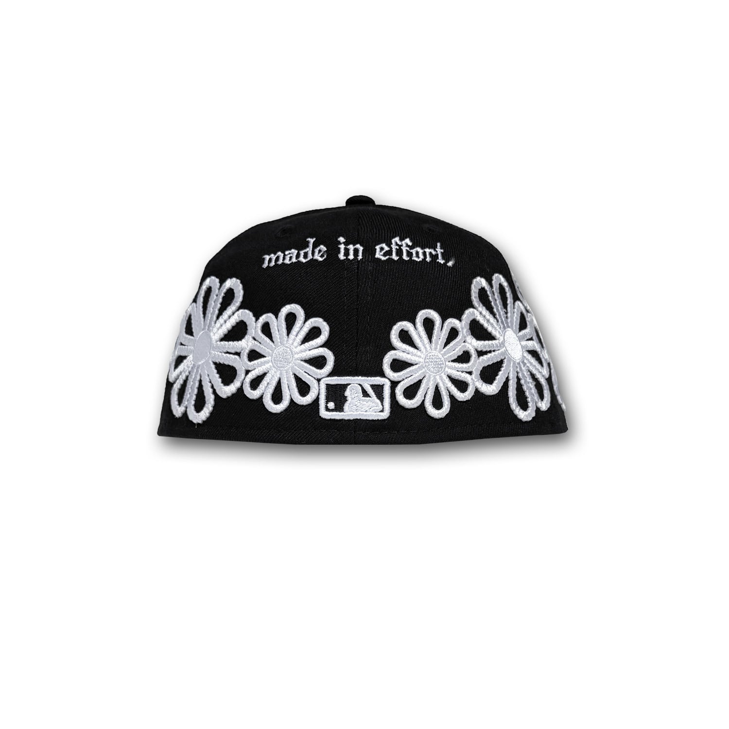 サイドとバックにフラワーデザインの刺繍パッチが施されたカスタムキャップ。