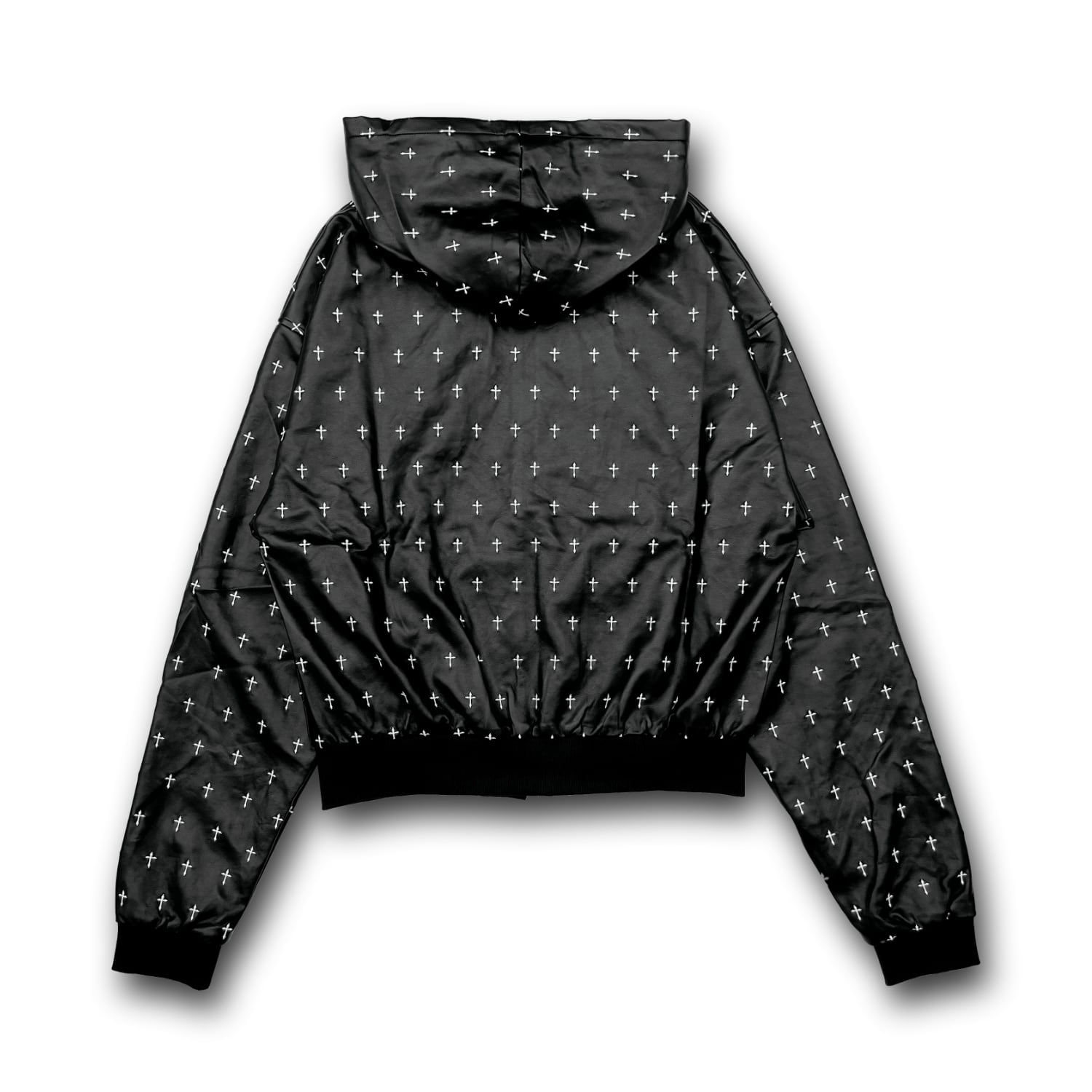 裏地にはメッシュ生地、フロントにクロスデザインの引き手付きジッパー。