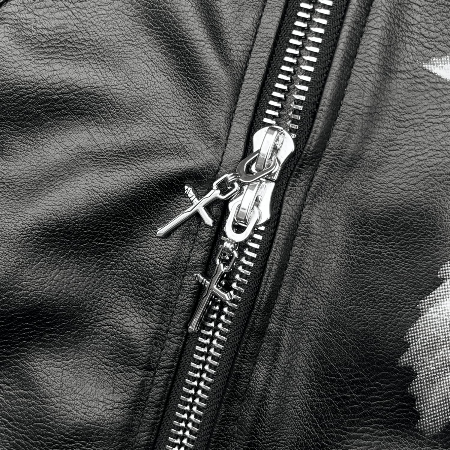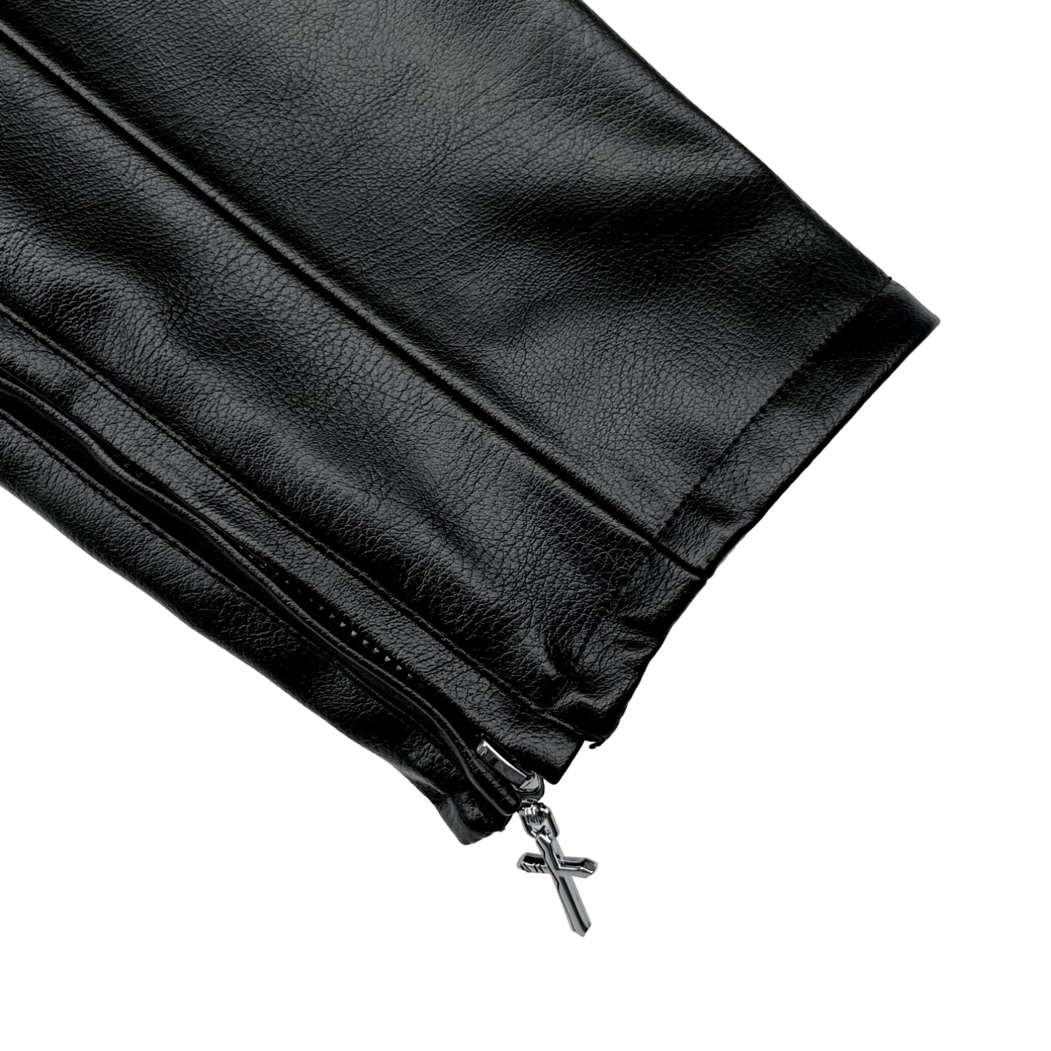 ブランドロゴが刻印されたボタン、ポケットにクロスデザインの引き手付きジッパー。
