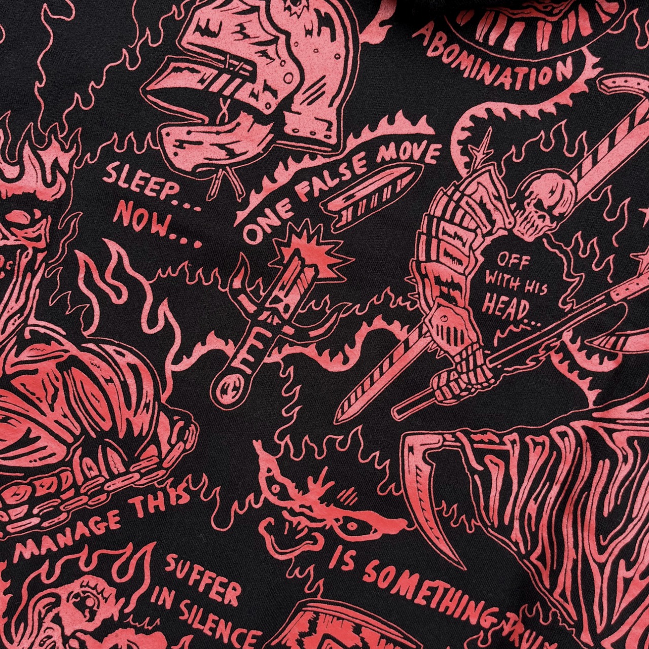 フロント左胸部分に刺繍、袖部分とバックには特大サイズのグラフィックデザインが落とし込まれております。