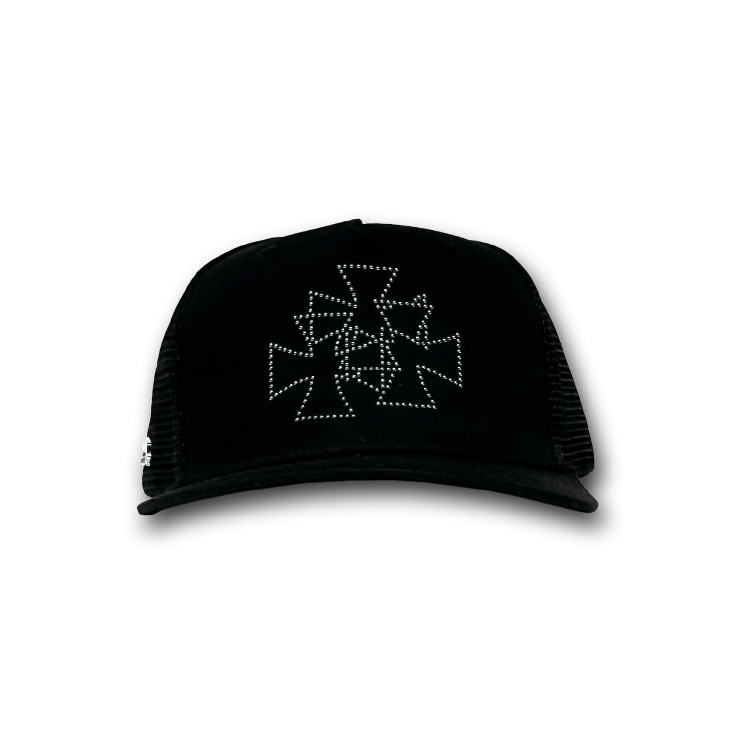 フロントにクロスデザインがスタッズで落とし込まれたトラッカーキャップ。