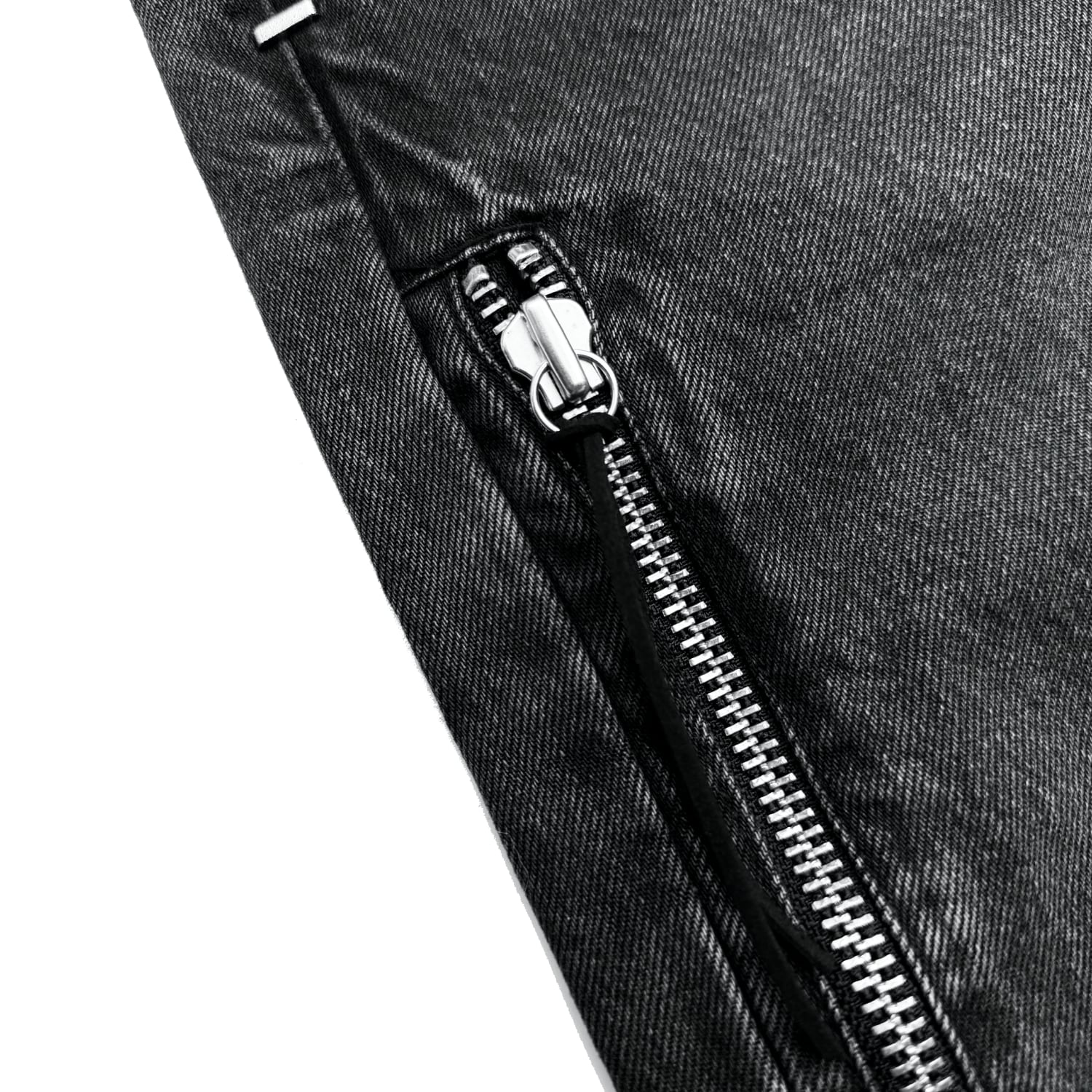 肉厚なヘビーウェイト生地が採用されており、全体的に細かなダメージ加工とフロントにレザープラー付きのサイドジップ。