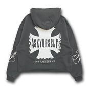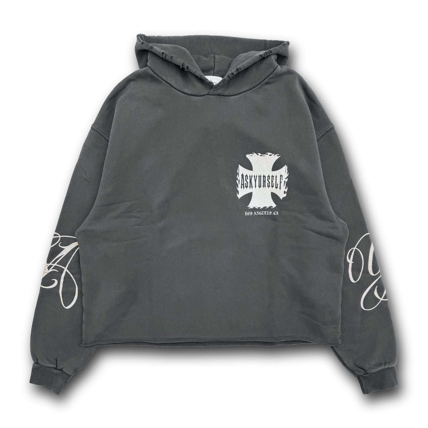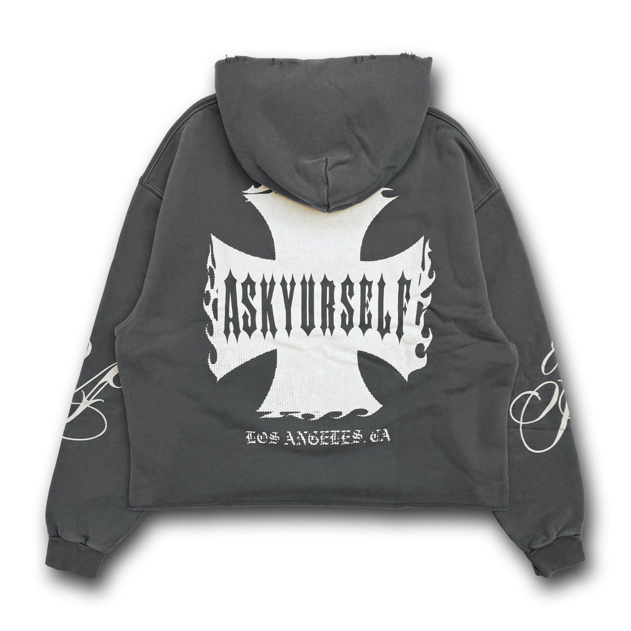 フード部分にダメージ加工、裾はカットオフデザイン。