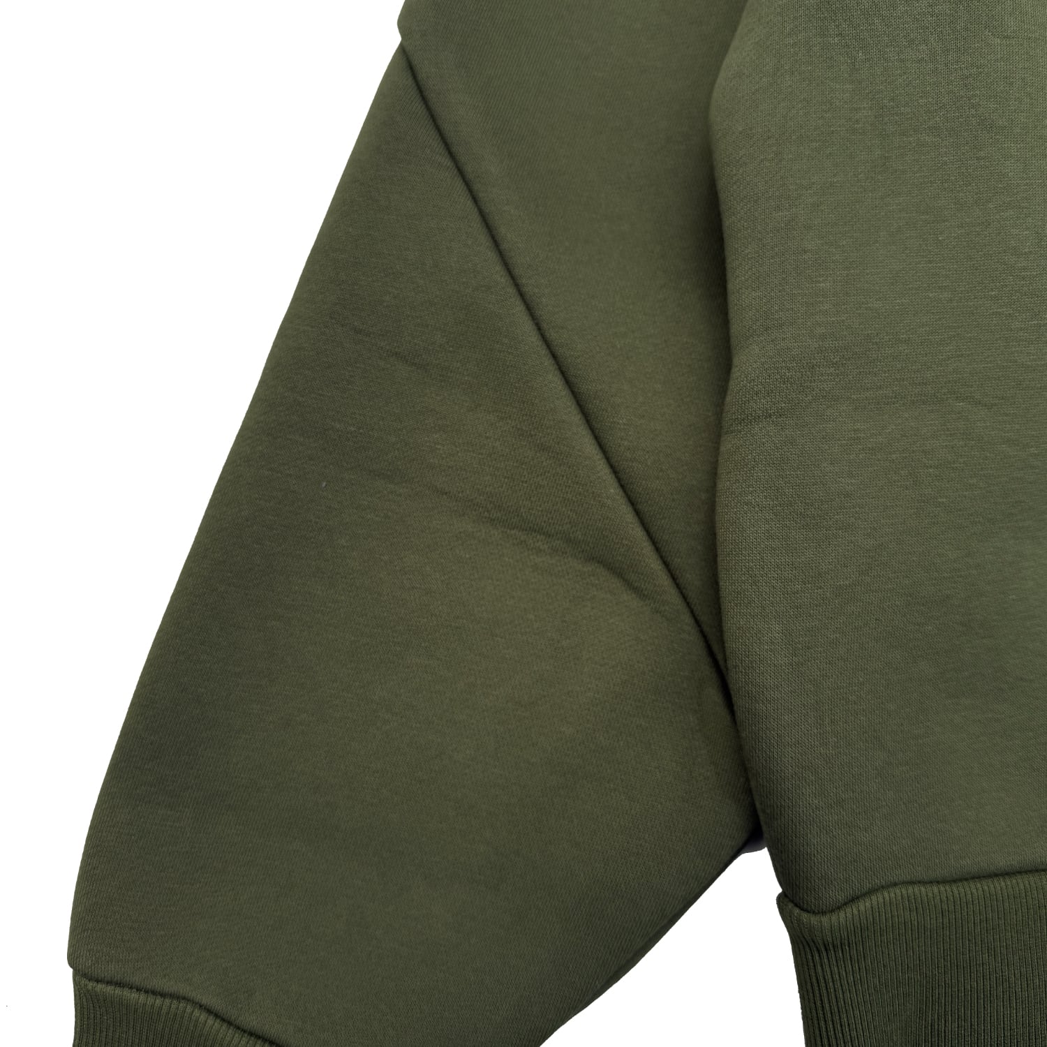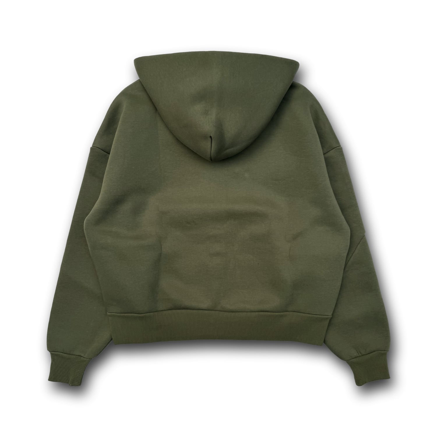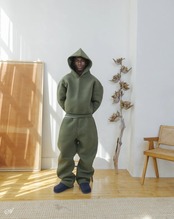肉厚で重量感のあるヘビーオンス生地で自立するフード部分、短めの着丈に身幅と肩幅が広いボックスシルエットとなっております。