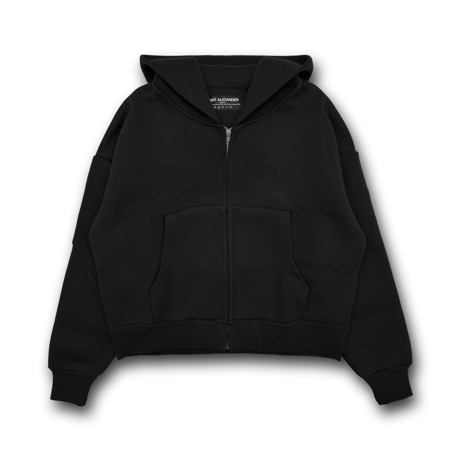 肉厚で重量感のあるヘビーオンス生地で自立するフード部分、短めの着丈に身幅と肩幅が広いボックスシルエットとなっております。
