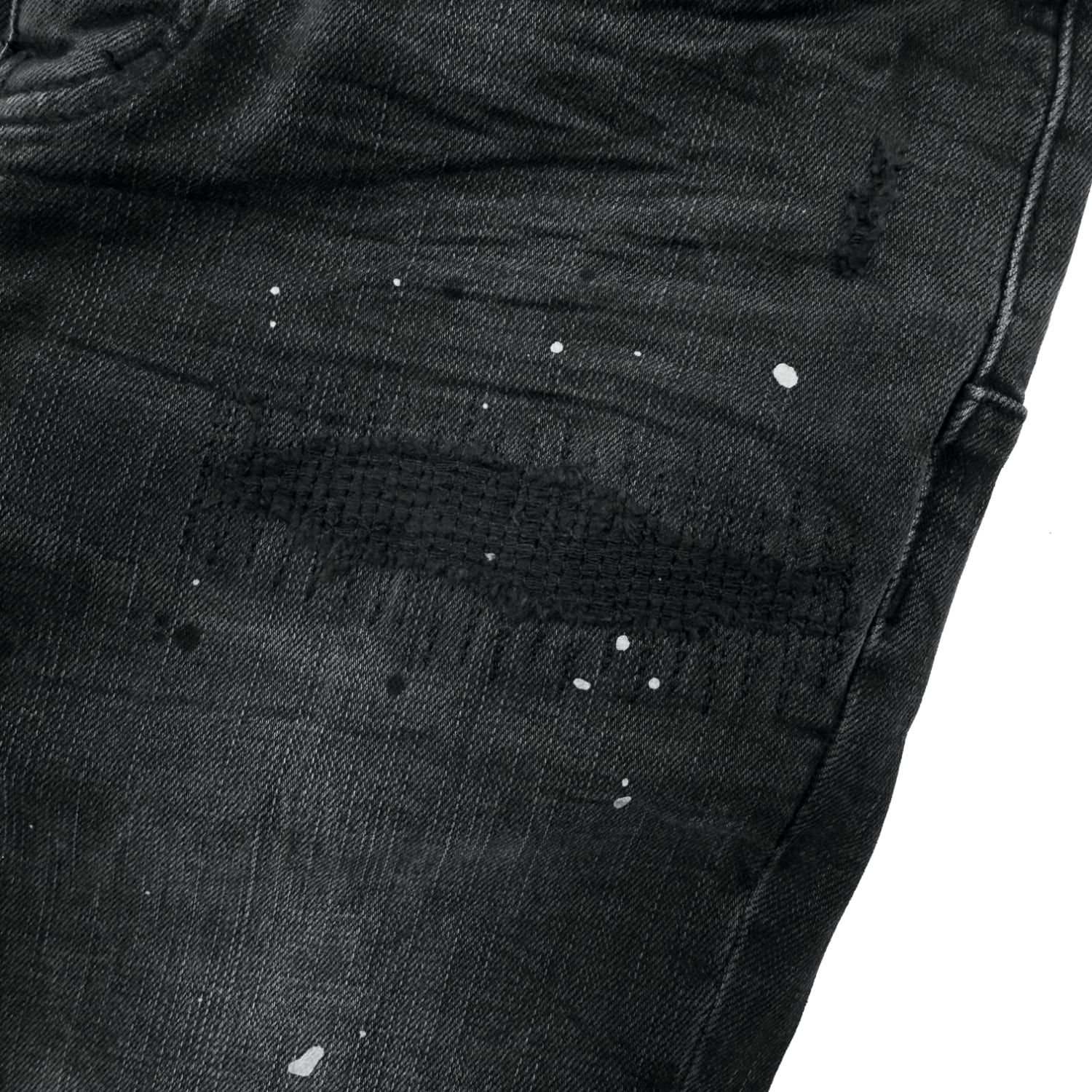 全体的にペンキ加工と両膝にダメージ加工が施されたスキニーデニム。