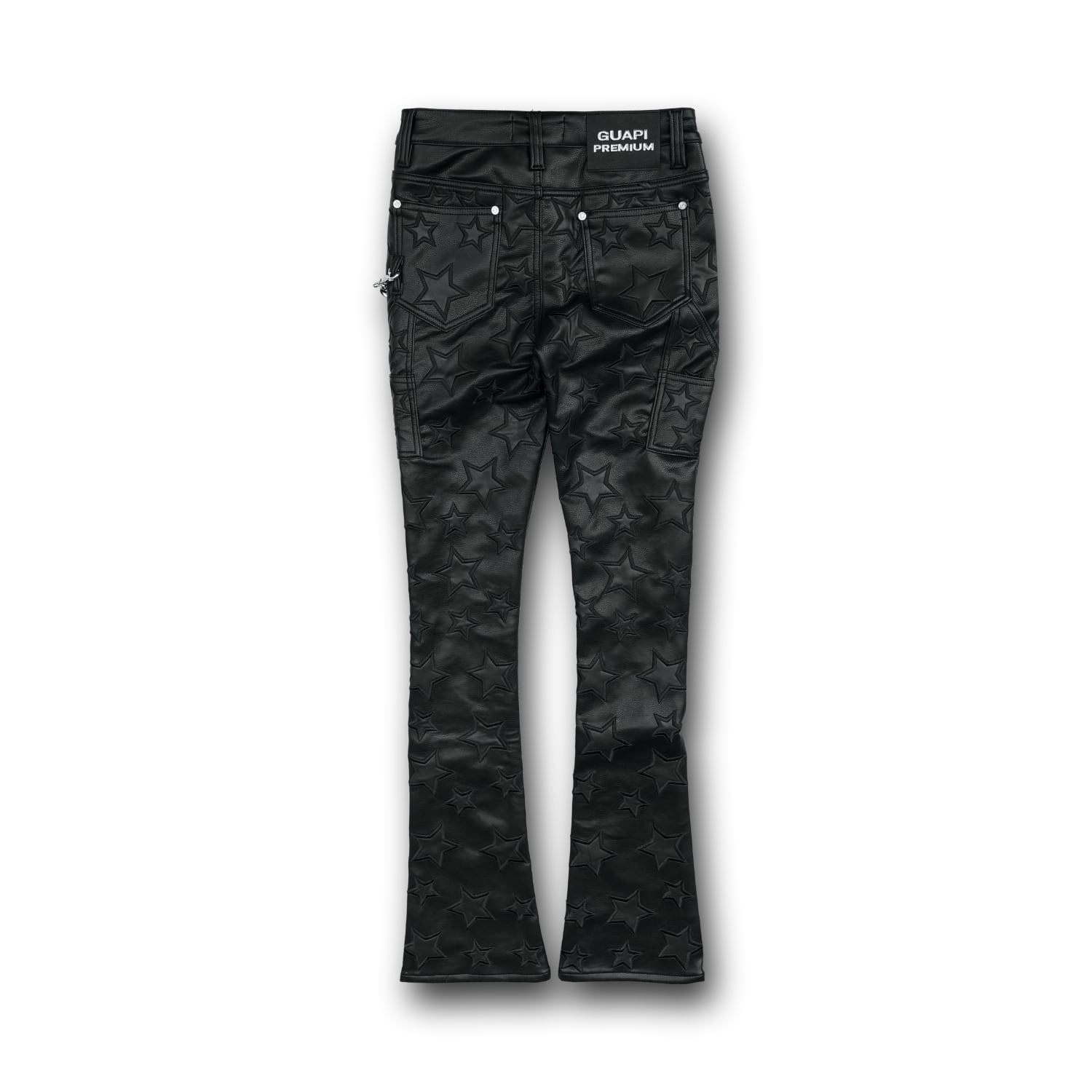 伸縮性のあるストレッチが効いたフレアレッグシルエットのレザーパンツ。