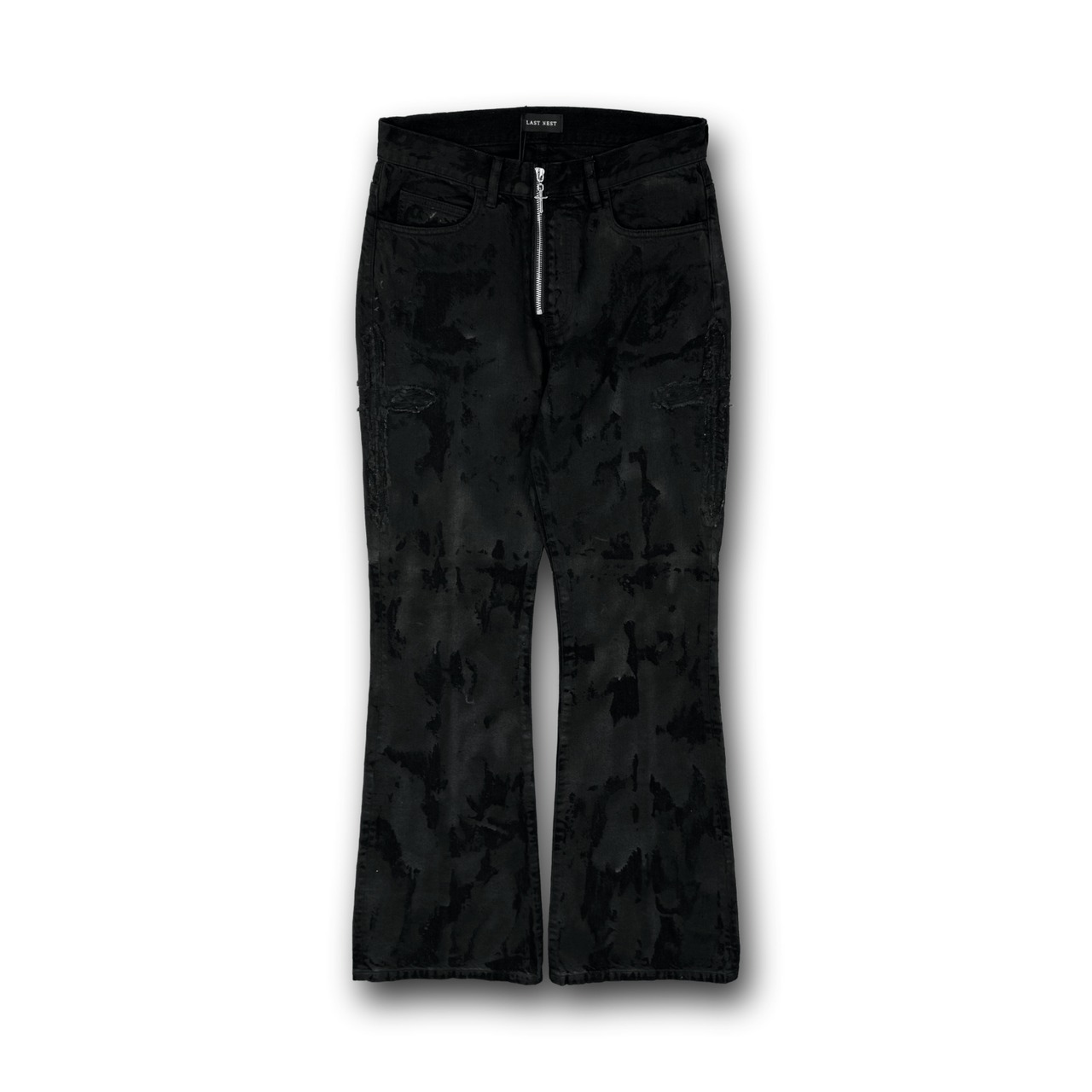 全体にコーティング加工が施されたフレアシルエットのデニムパンツ。