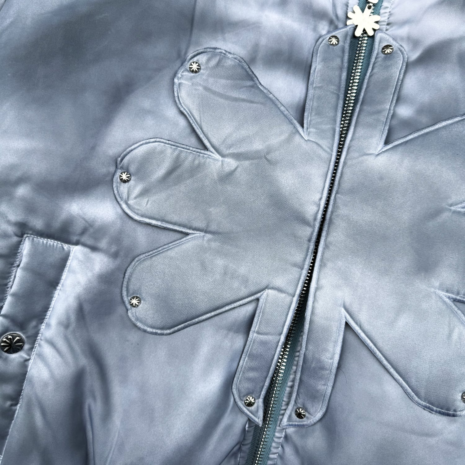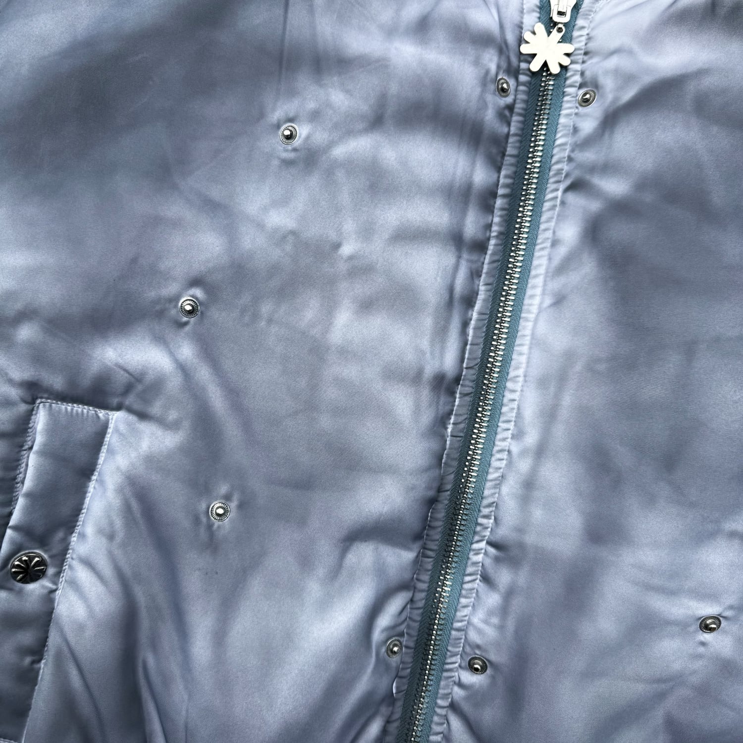 ブランドオリジナルのボタン、フロントにブランドロゴデザインの引き手付きジッパー。