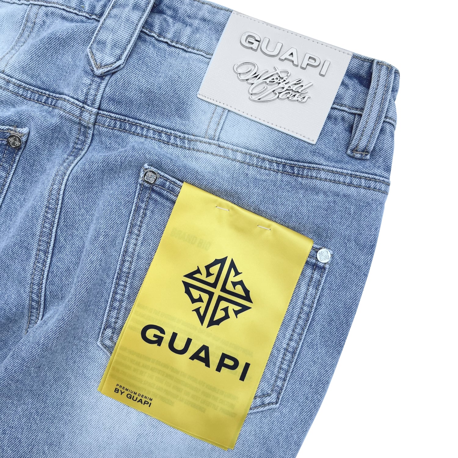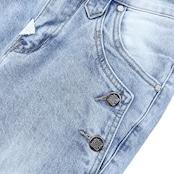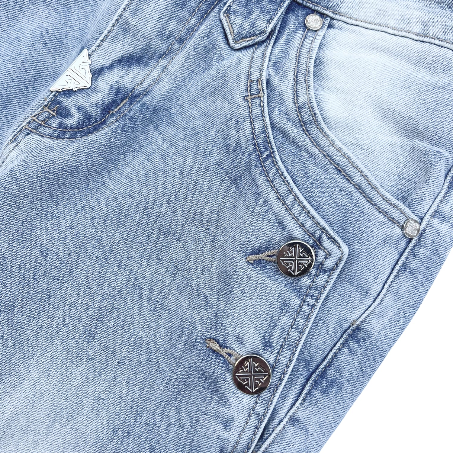 ブランドオリジナルのボタンとリベット、バックのレザーパッチ。