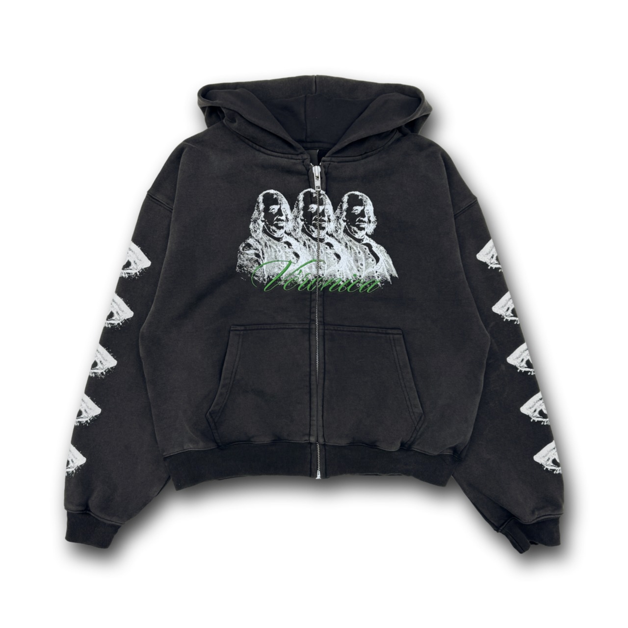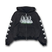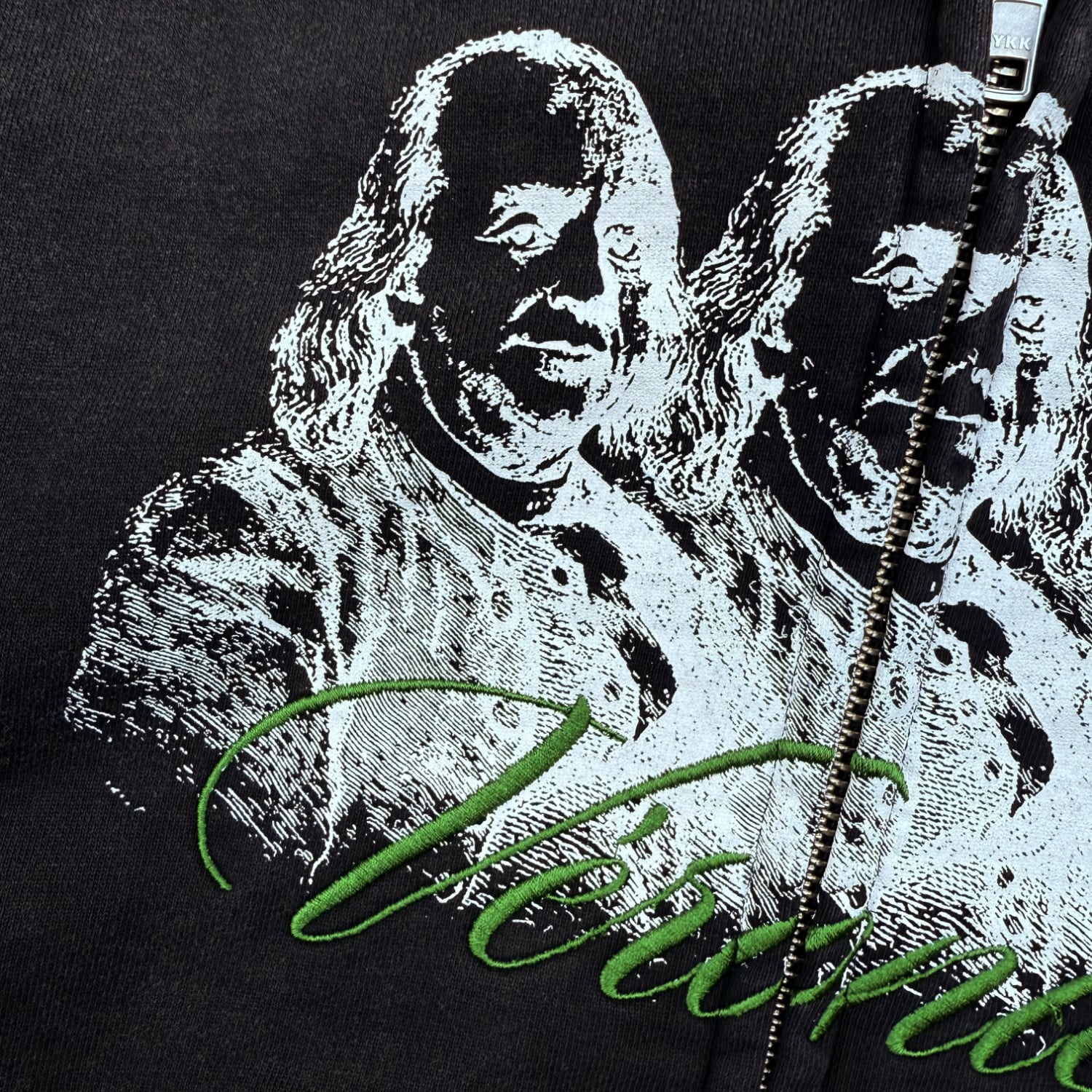 フロントにはジッパーを跨いでグラフィックデザインと刺繍でテキストデザイン、バックと袖部分にグラフィックデザインが落とし込まれております。