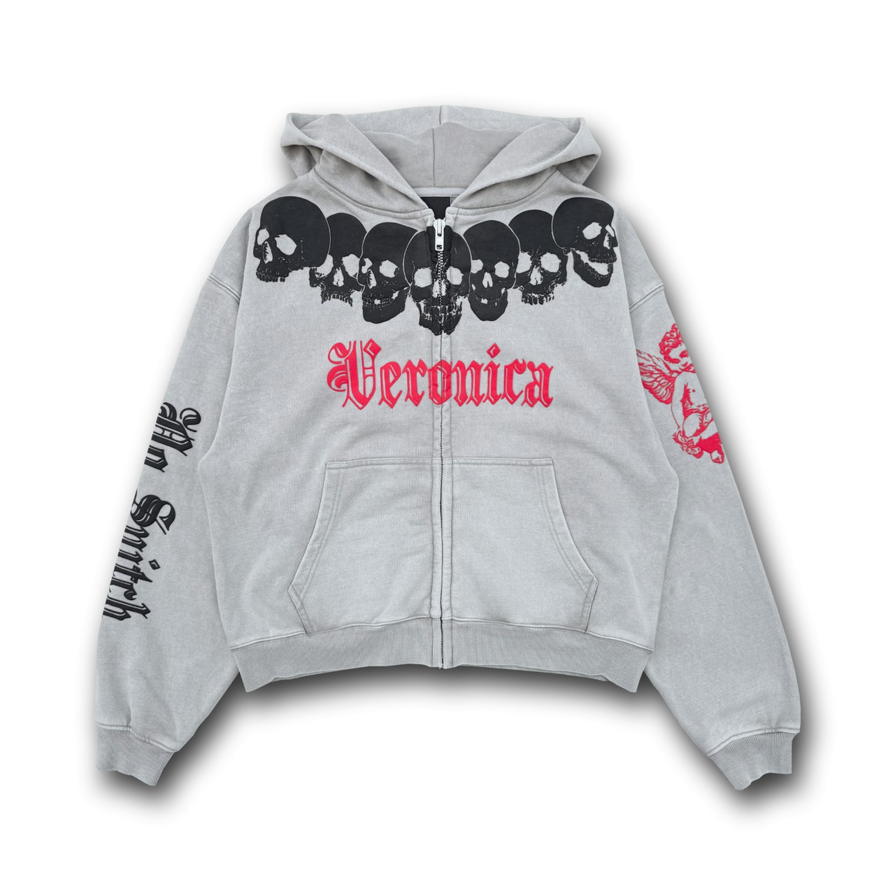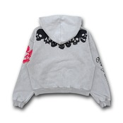 フロントにはジッパーを跨いで、他にもバックと袖や肩部分にヴィンテージ加工の発泡プリントでグラフィックデザインが落とし込まれております。