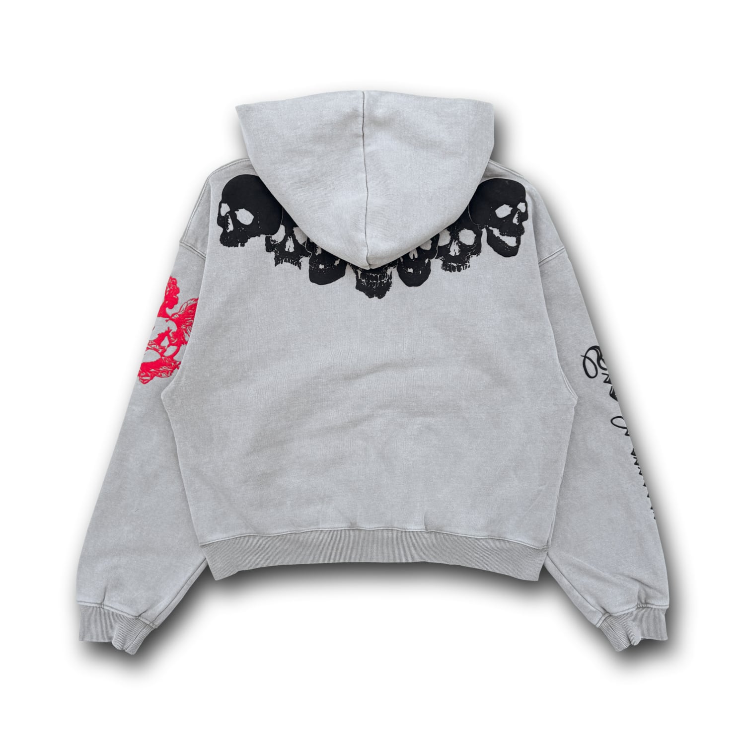 ヴィンテージの風合いが表現されたウォッシュ加工が施されたジップフーディー。