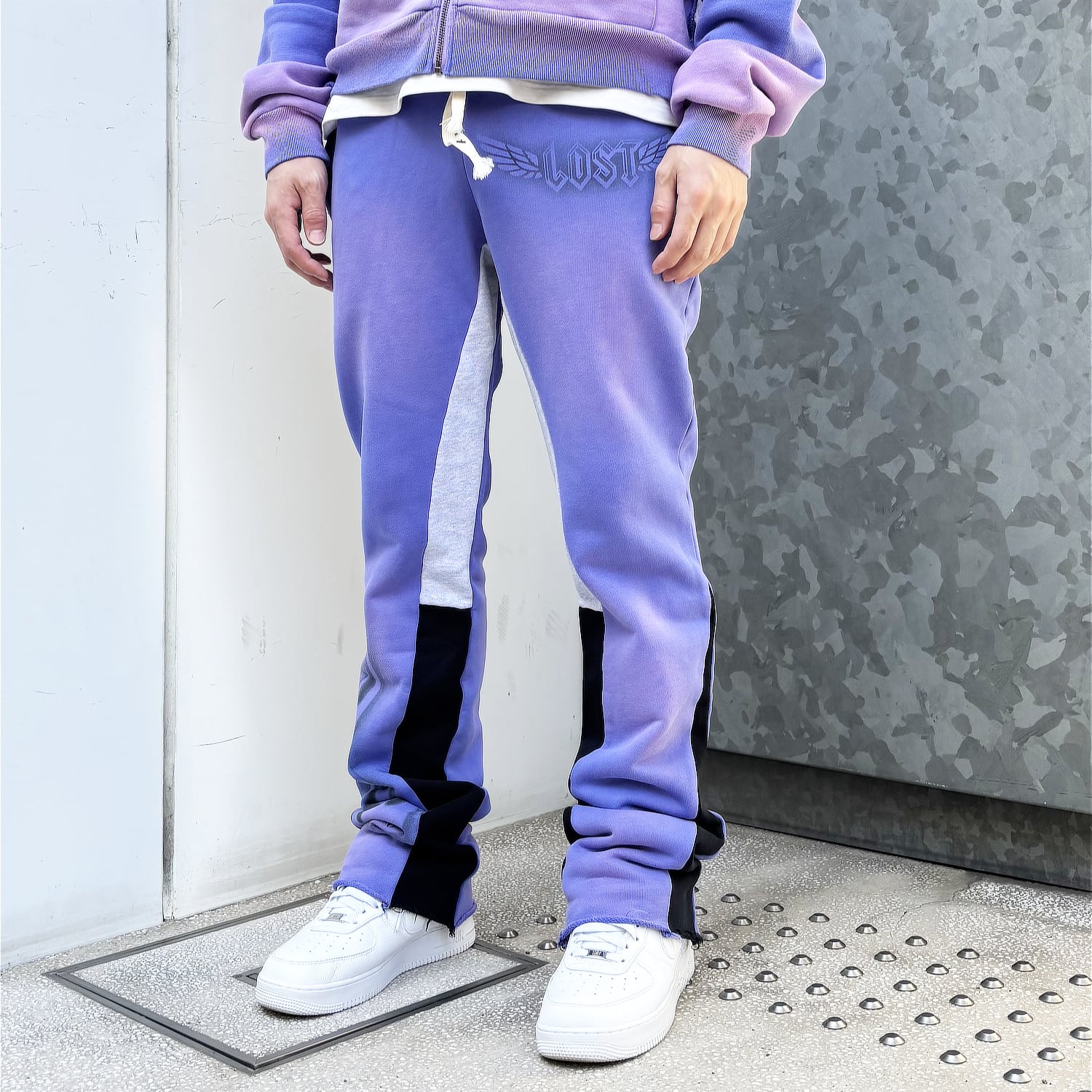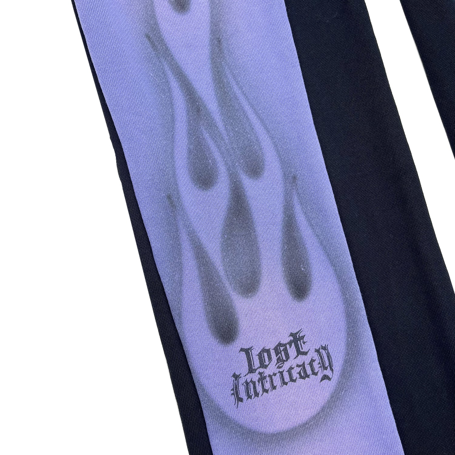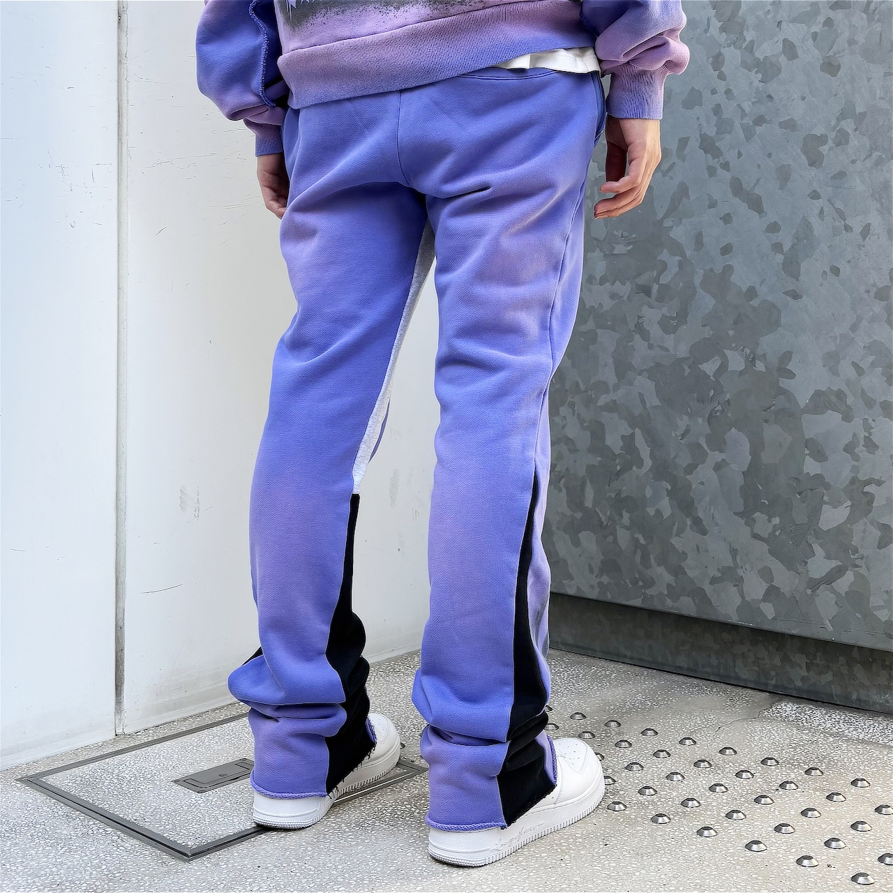 裾部分はカットオフデザインとダメージ加工、インサート部分には黒とグレーのスウェット生地が採用されております。
