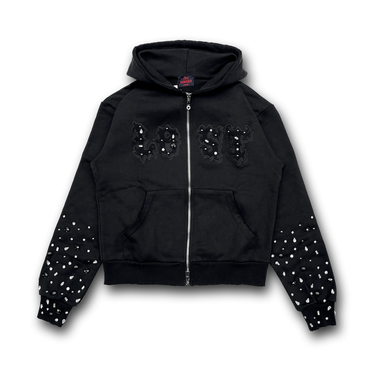 フロントはダブルジッパー開閉で、ブランドロゴ入りのジッパー引き手部分にもラインストーン付き。