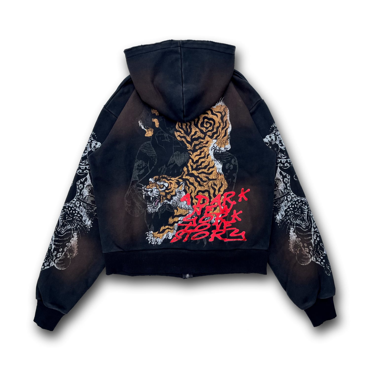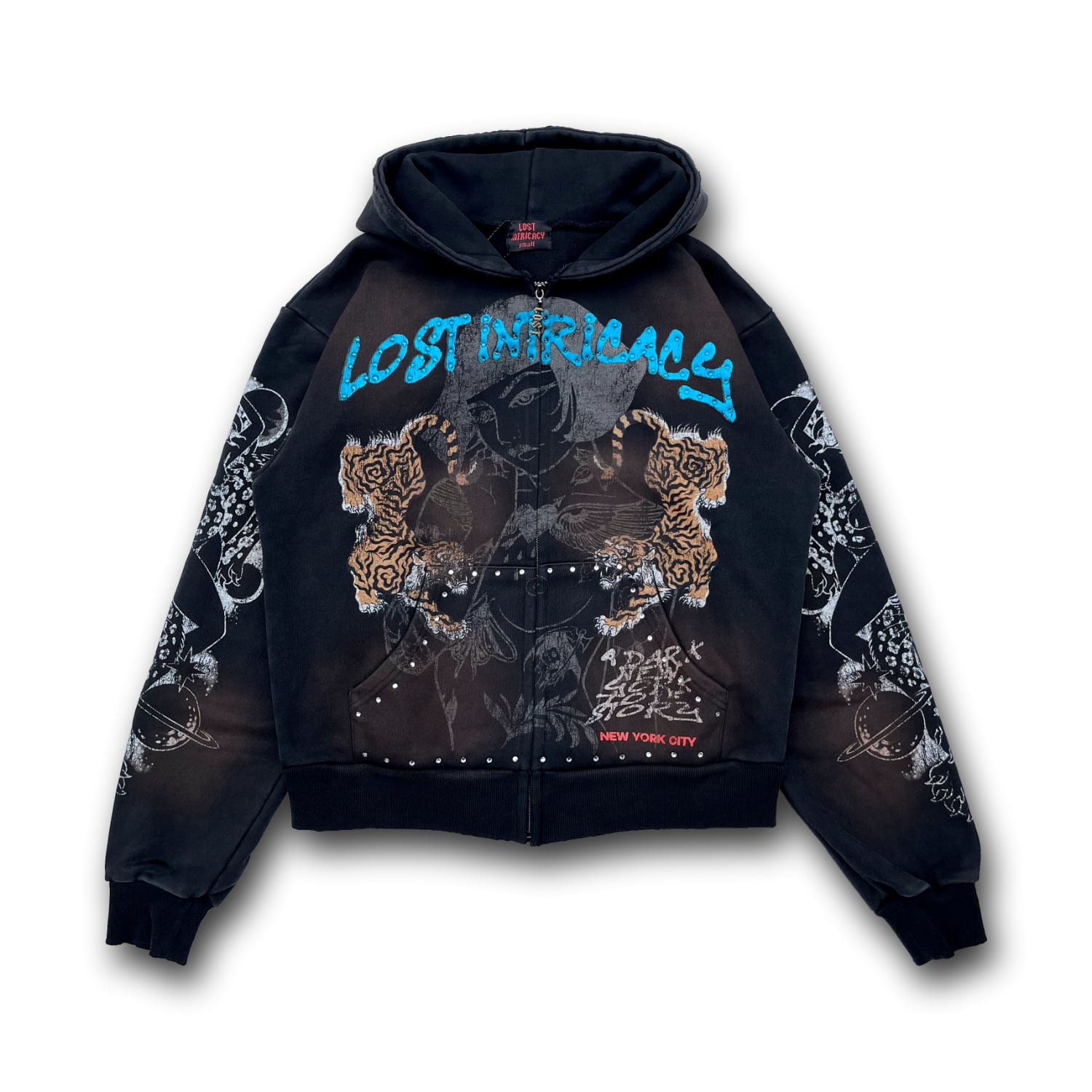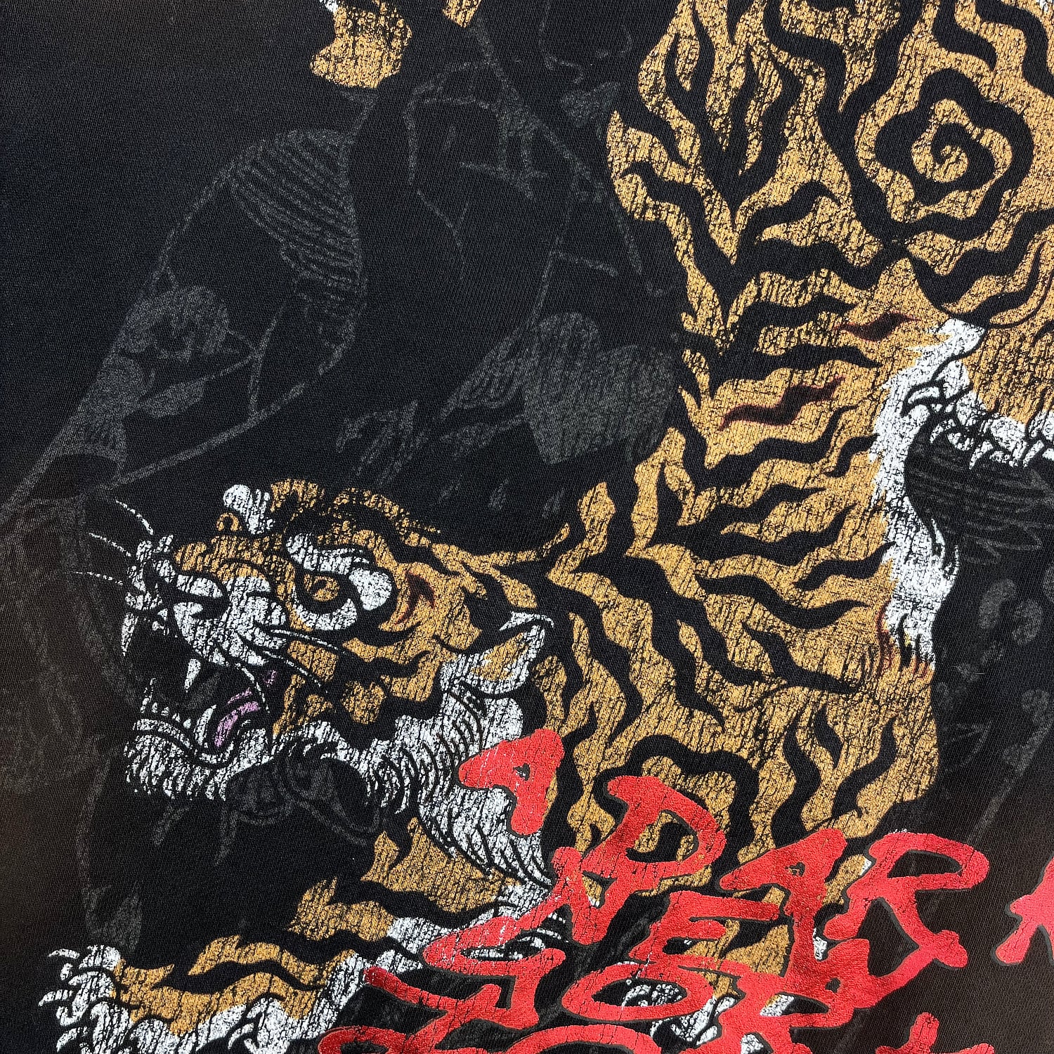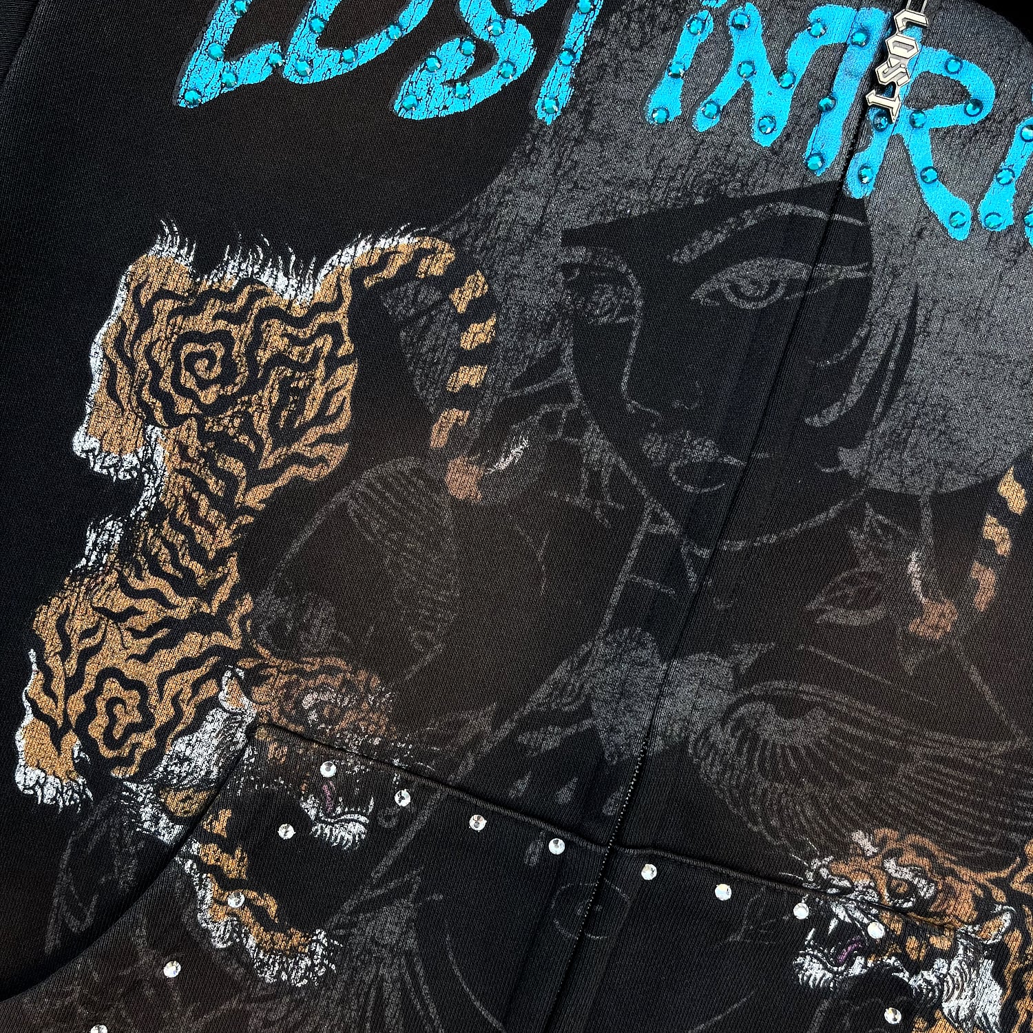 フロントロゴとポケット部分にラインストーンが散りばめられており、フロントとバック、袖部分にはヴィンテージ調のグラフィックデザインが落とし込まれております。