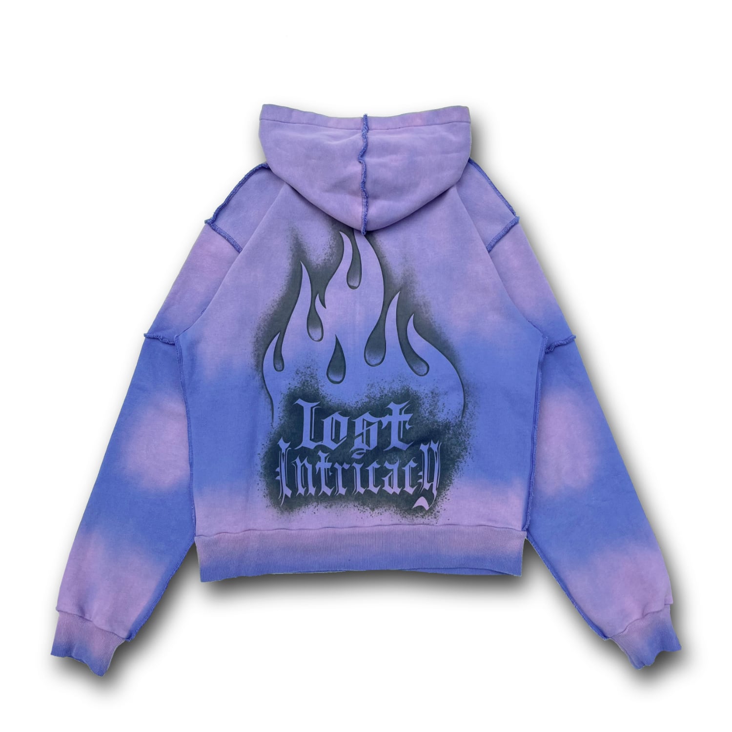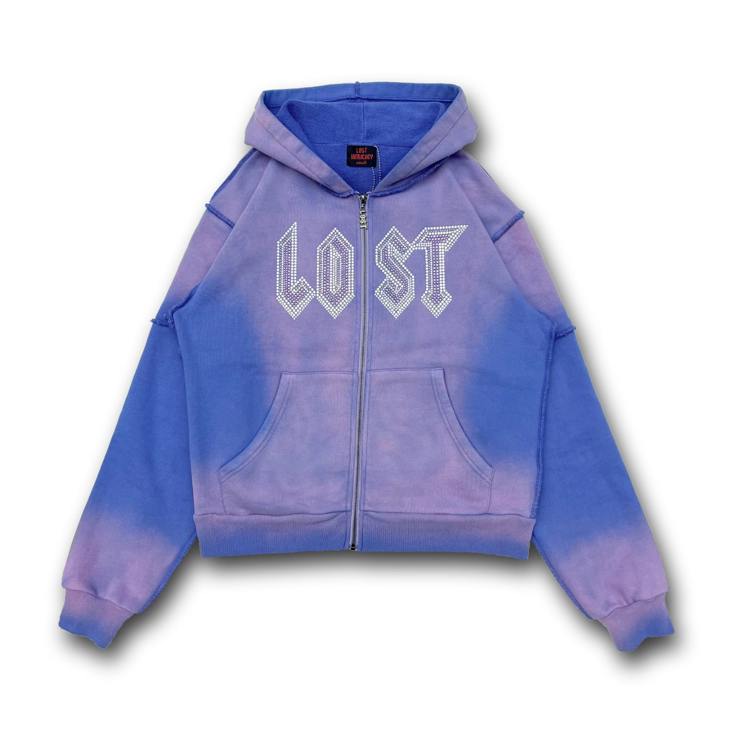 ヴィンテージのフェード加工が施されたジップフーディー。