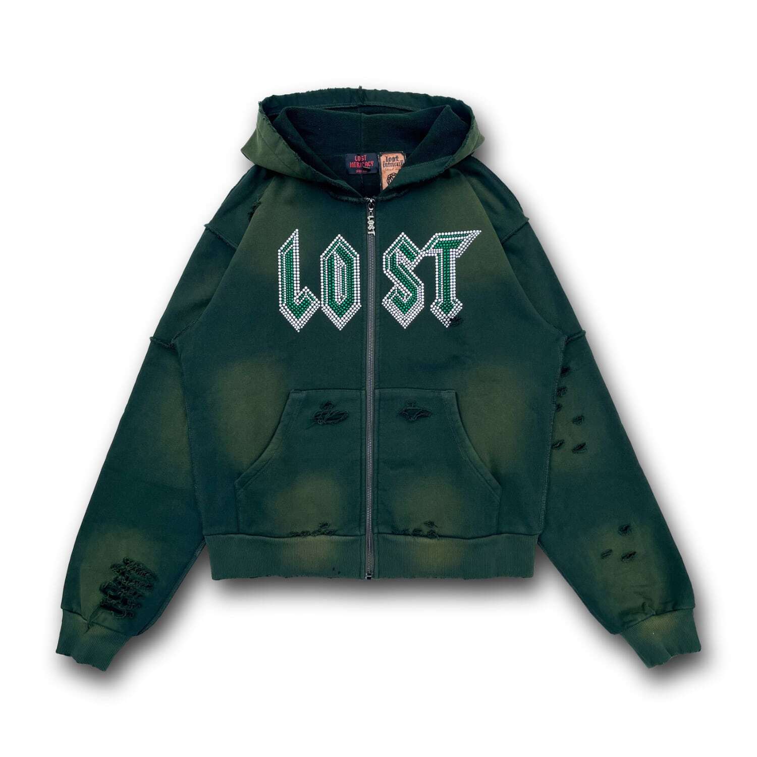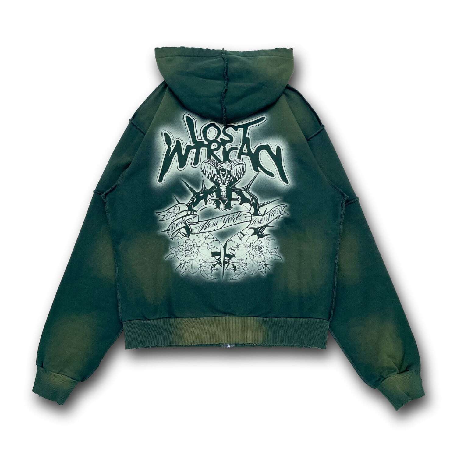 ヴィンテージのフェード加工が施されたジップフーディー。