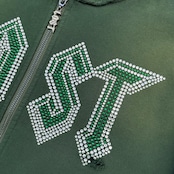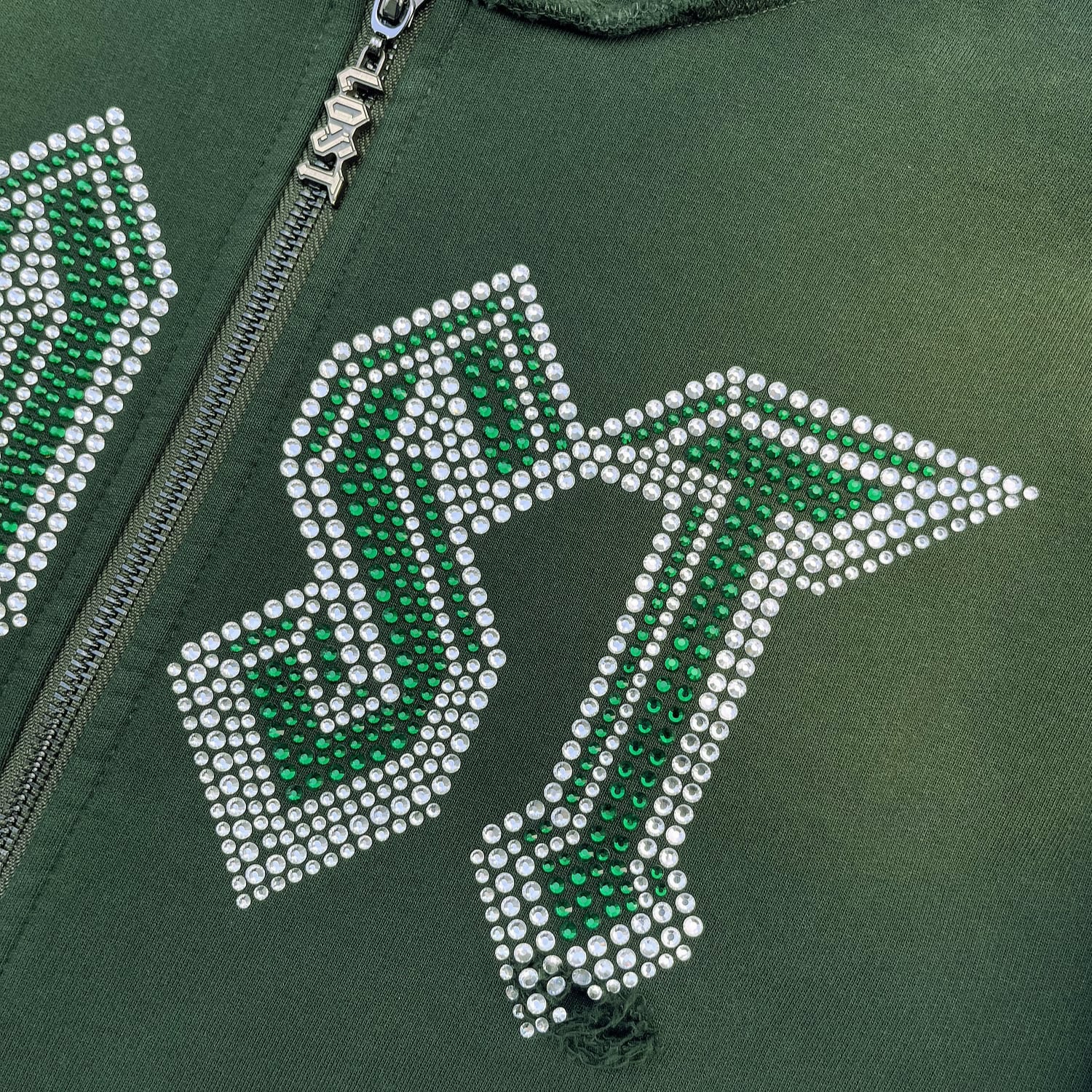 フロントにはラインストーンでブランドロゴデザイン、バックにはスプレー調でグラフィックデザインが落とし込まれております。