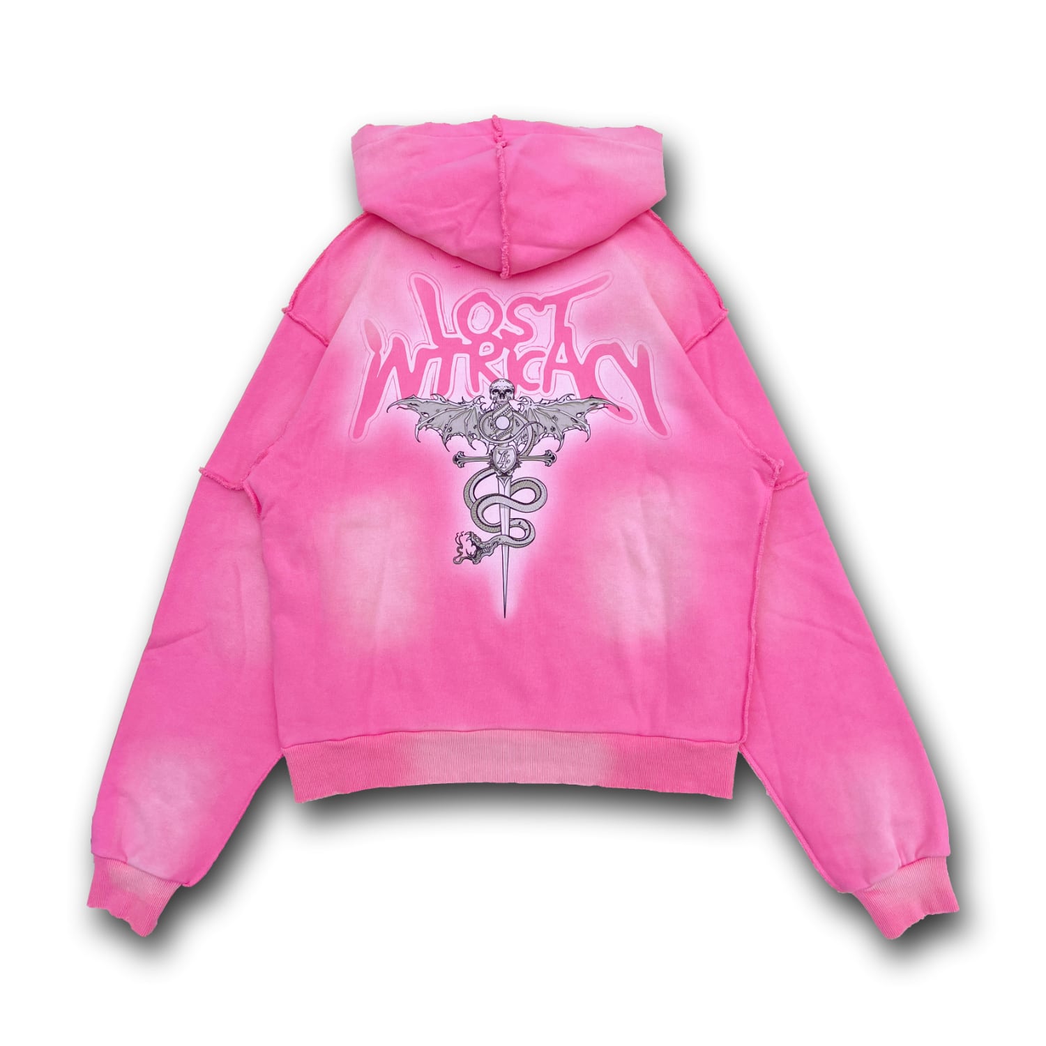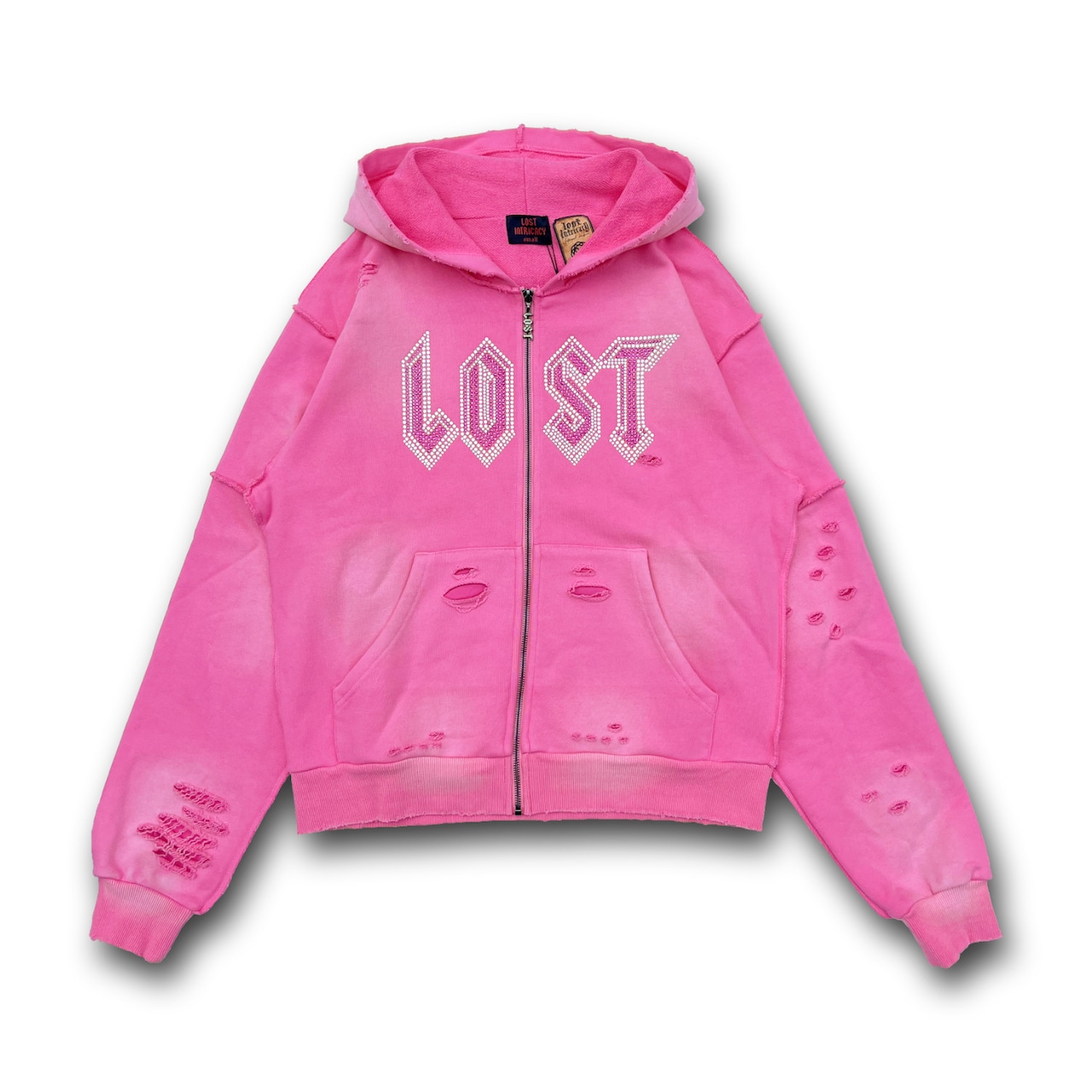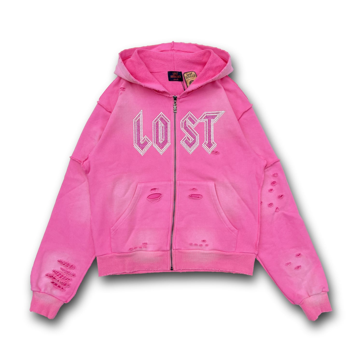 ヴィンテージのフェード加工が施されたジップフーディー。