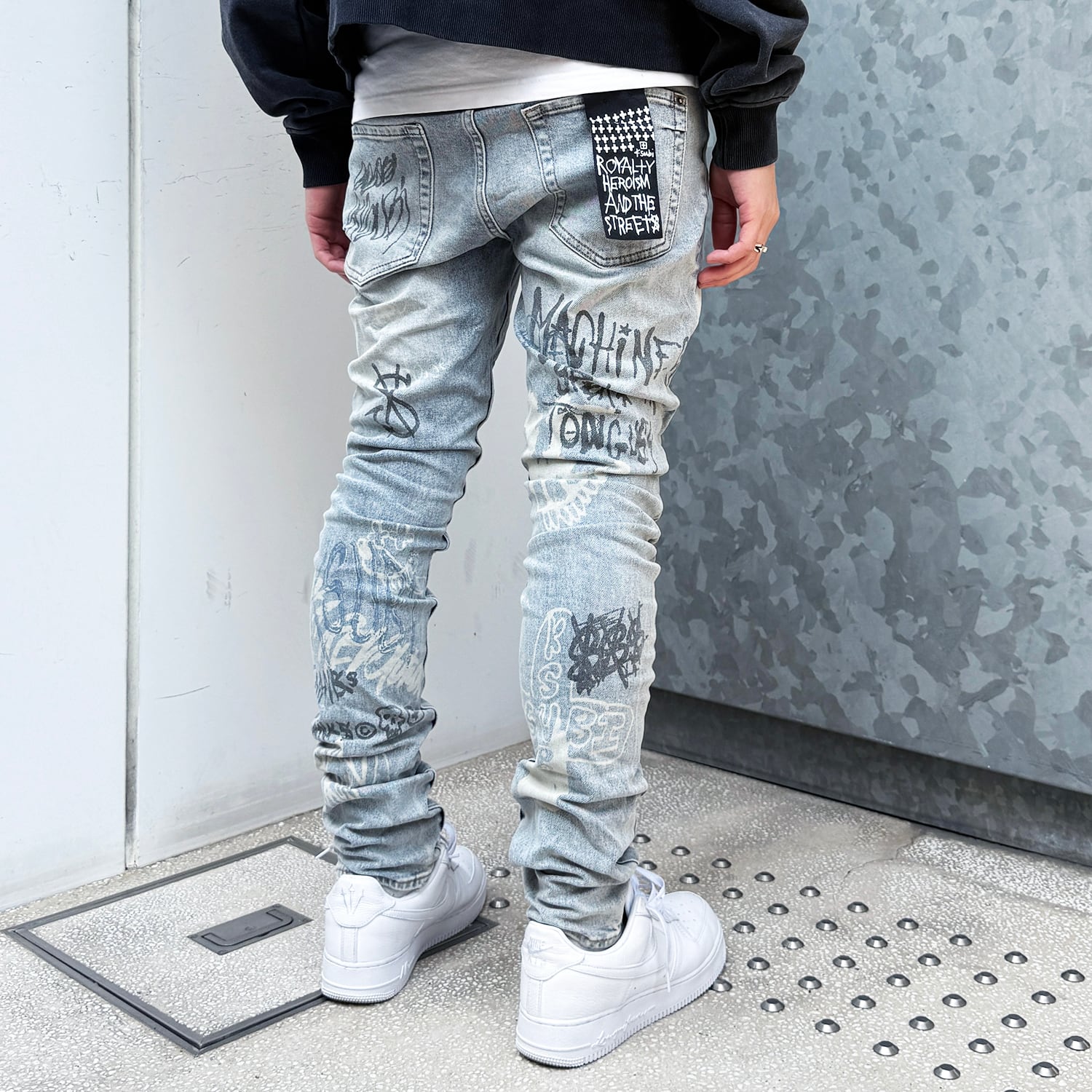 ストーンウォッシュ加工とエイジング加工が施されたスキニーデニム。