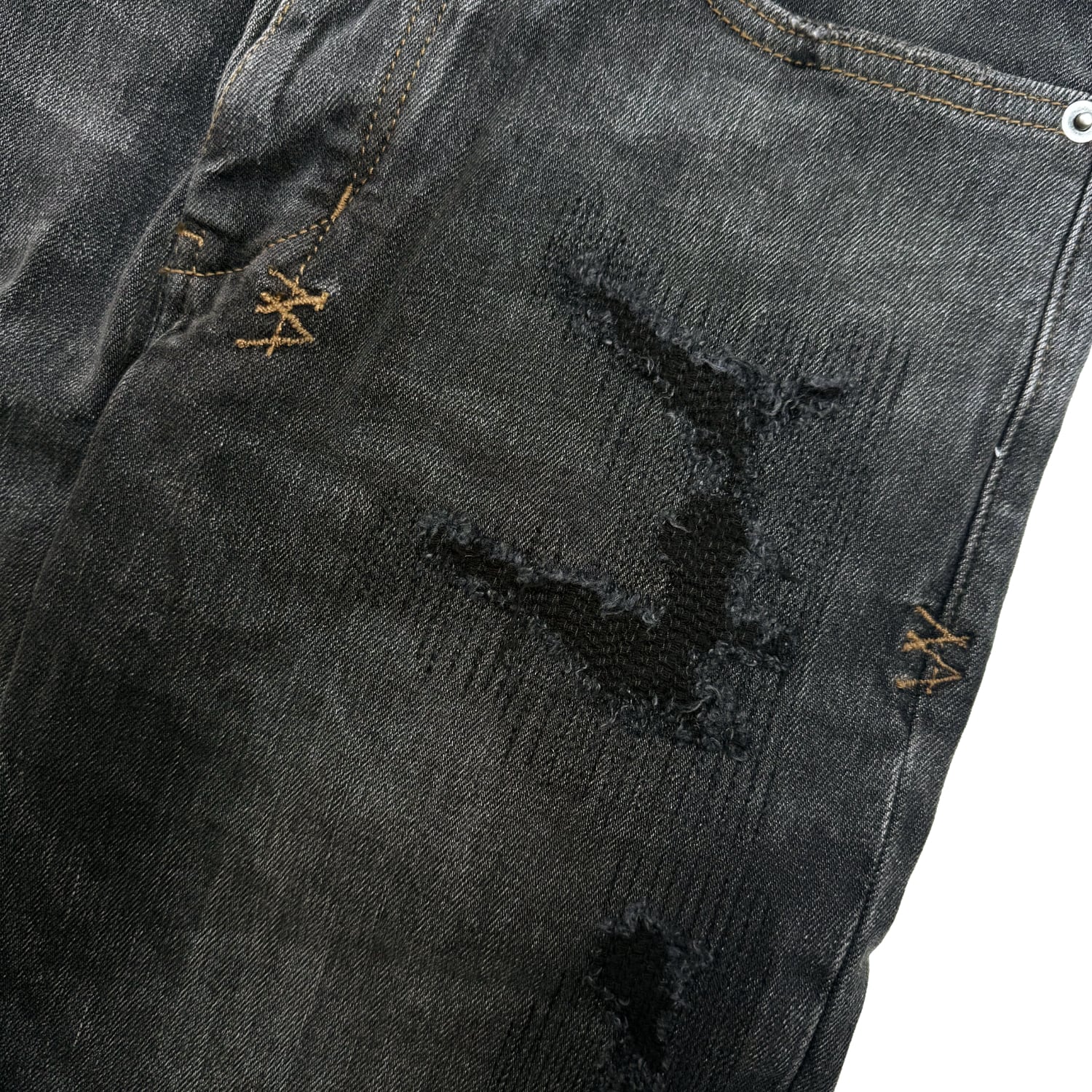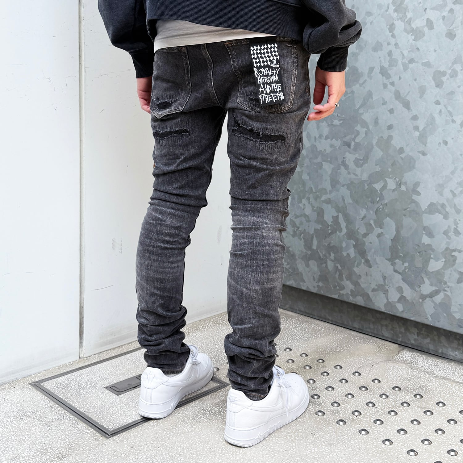 全面にダメージ加工、後ろポケットにシグネチャー織りタグ。