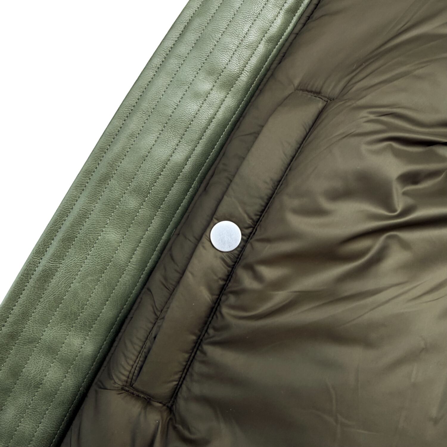 通常のボンバージャケットよりもパンパンに詰まった中綿、フロントジッパー裏にレザーウインドフラップが採用され高い防風防寒性を誇ります。