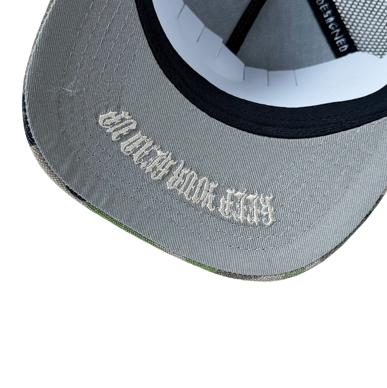 トップ部分にはブランドオリジナルのデザインが入ったボタン、つば裏にはグラフィックテキストデザイン。