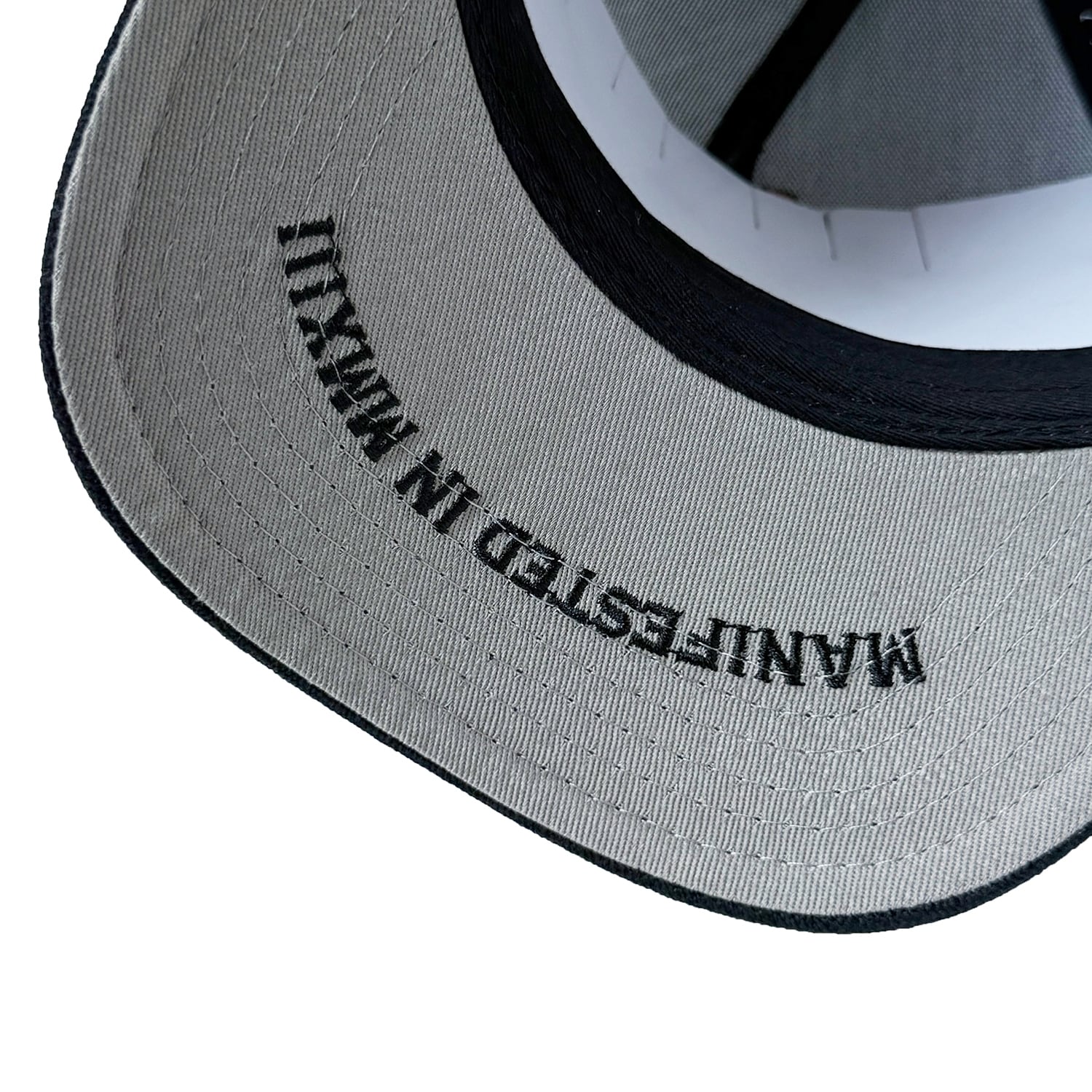 トップ部分にはブランドオリジナルのデザインが入ったボタン、つば裏にはグラフィックテキストデザイン。