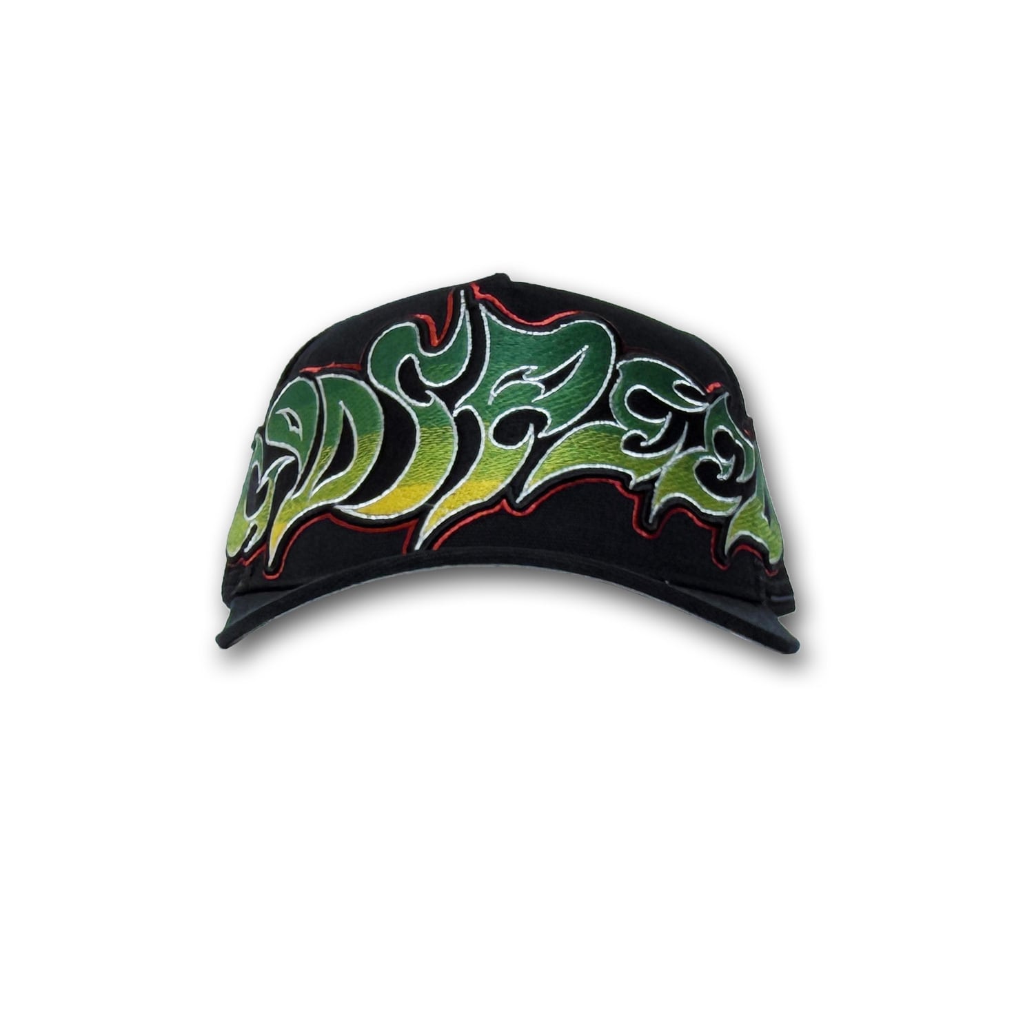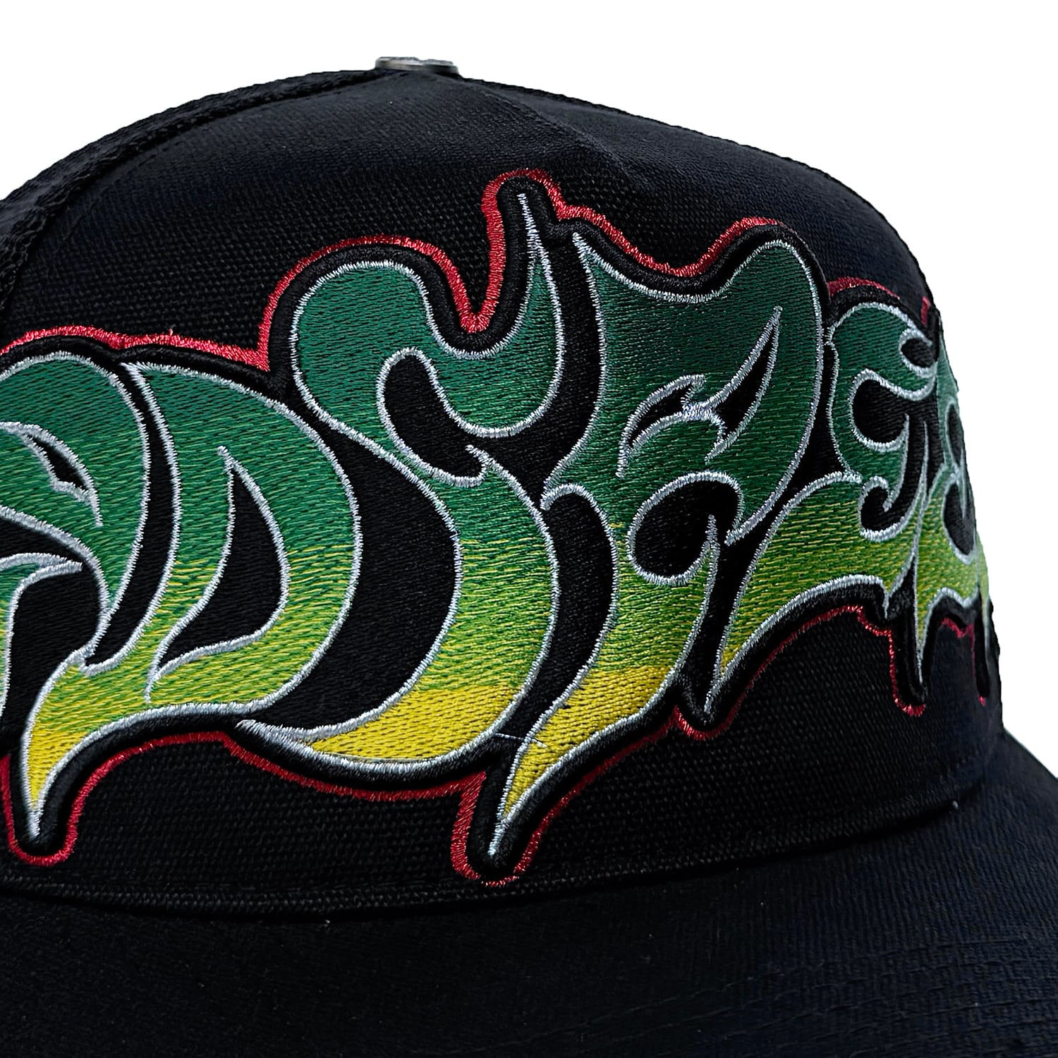 フロントからサイドにかけてブランドのグラフィックロゴデザインが厚みのあるグラデーション刺繍で落とし込まれております。
