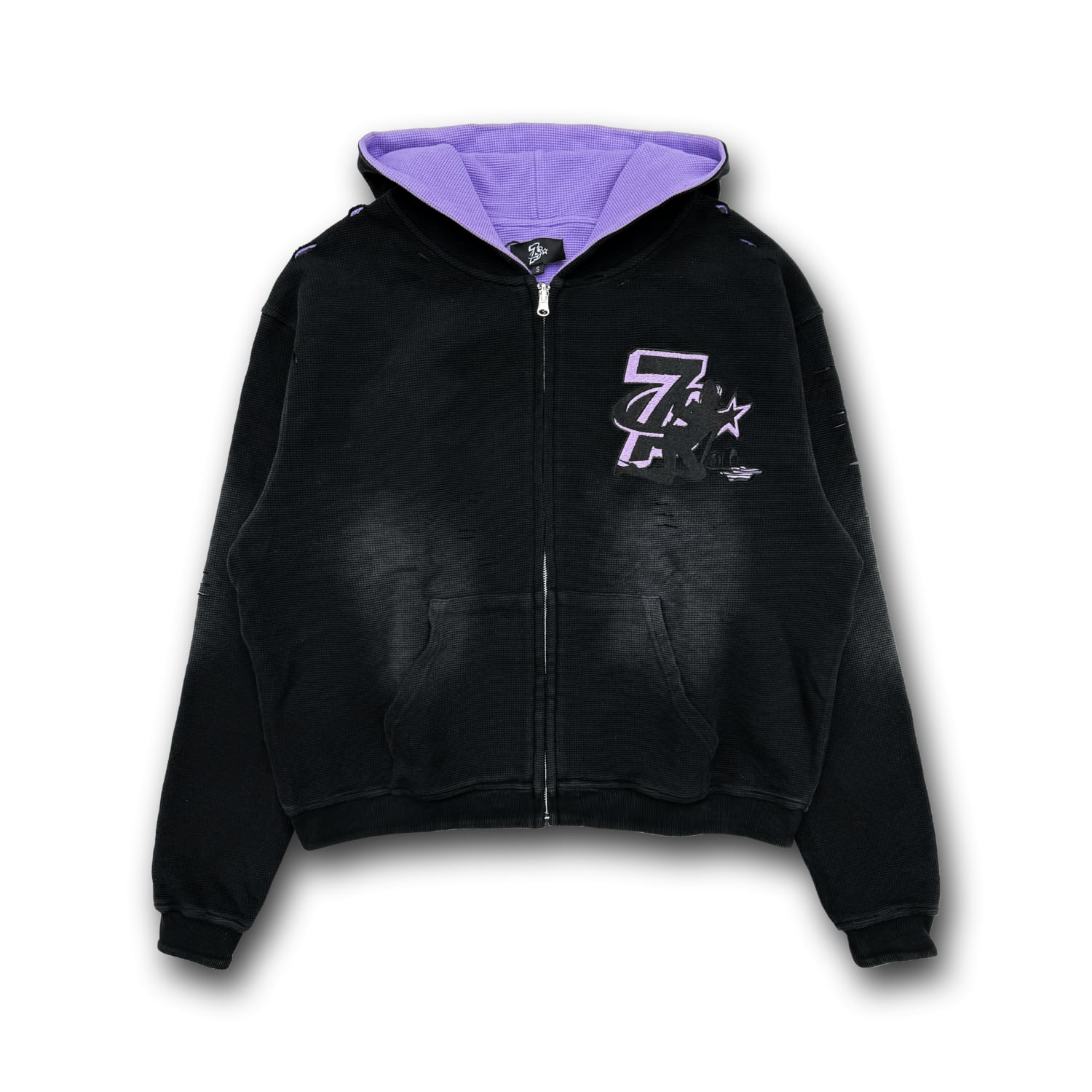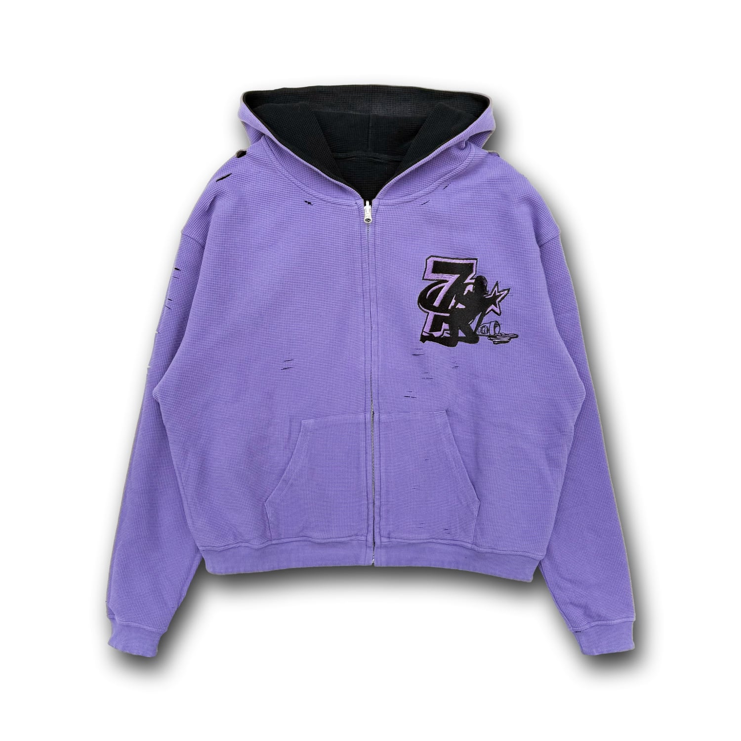ウォッシュ加工が施された肉厚なサーマル生地のジップフーディー。