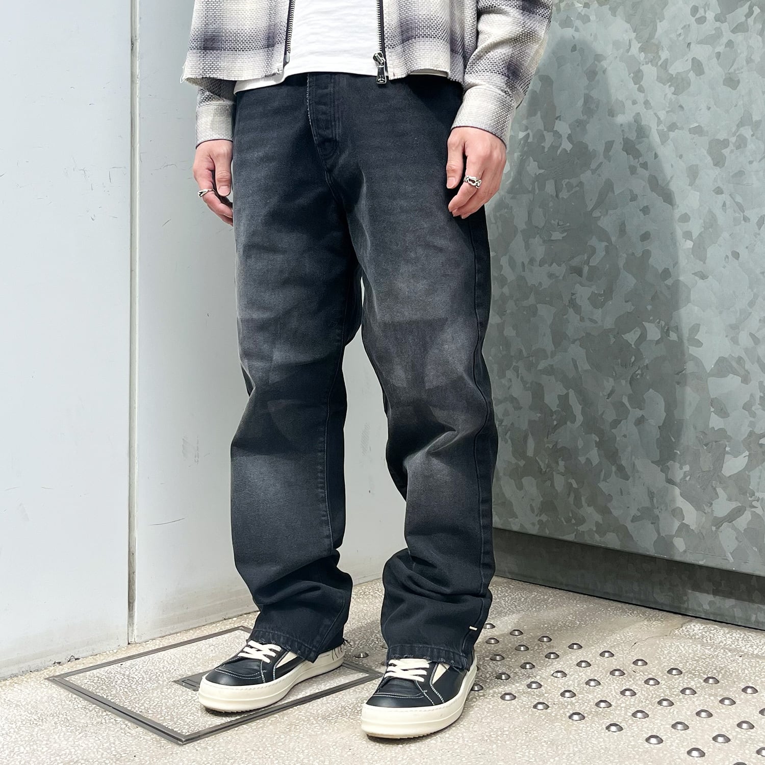 ウォッシュ加工が施されたストレートシルエットのデニムパンツ。