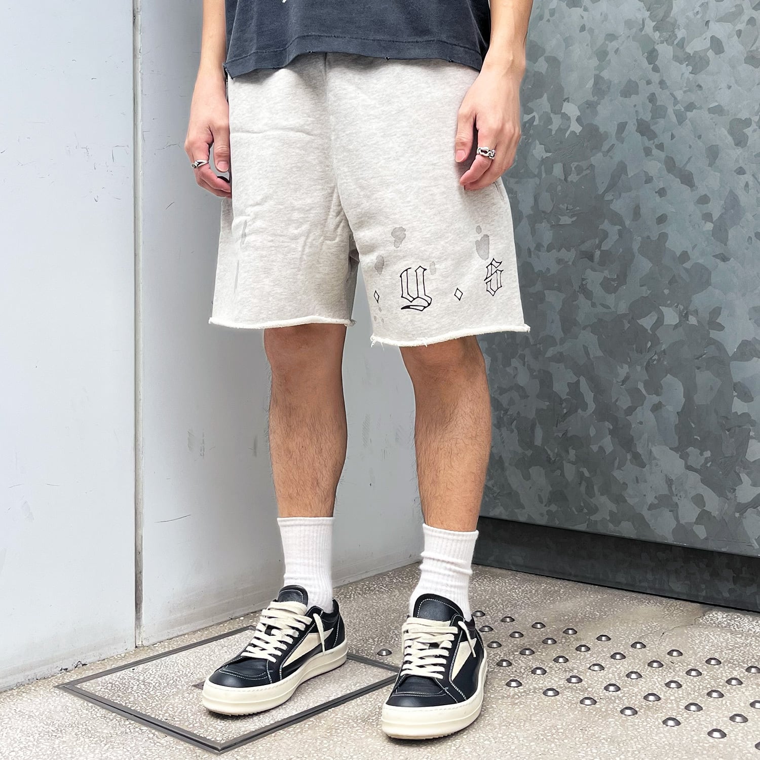 左脚部分にはヴィンテージの経年劣化を表現する技法のプリントでブランドロゴのデザインが落とし込まれております。