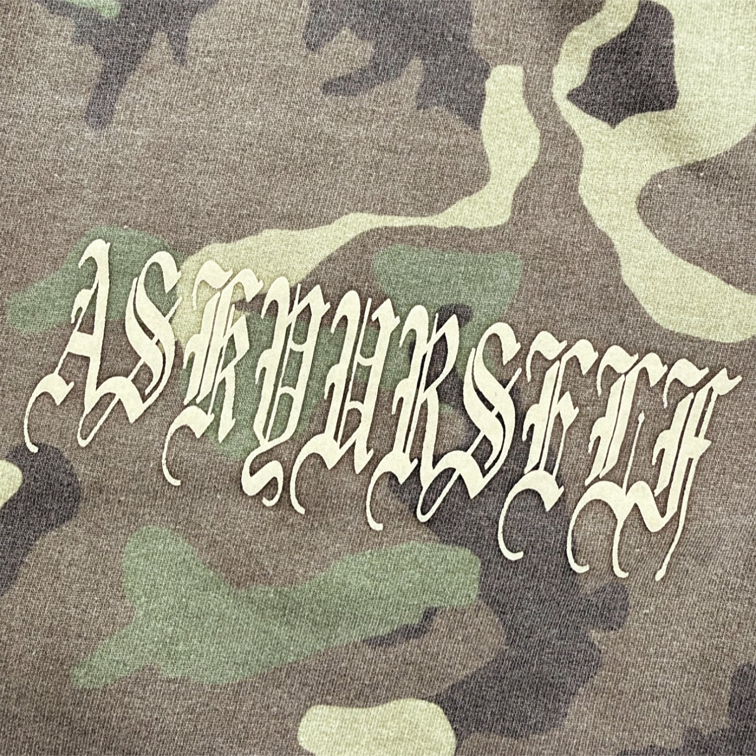 左脚部分にはヴィンテージの経年劣化を表現する技法のプリントでブランドロゴのデザインが落とし込まれております。