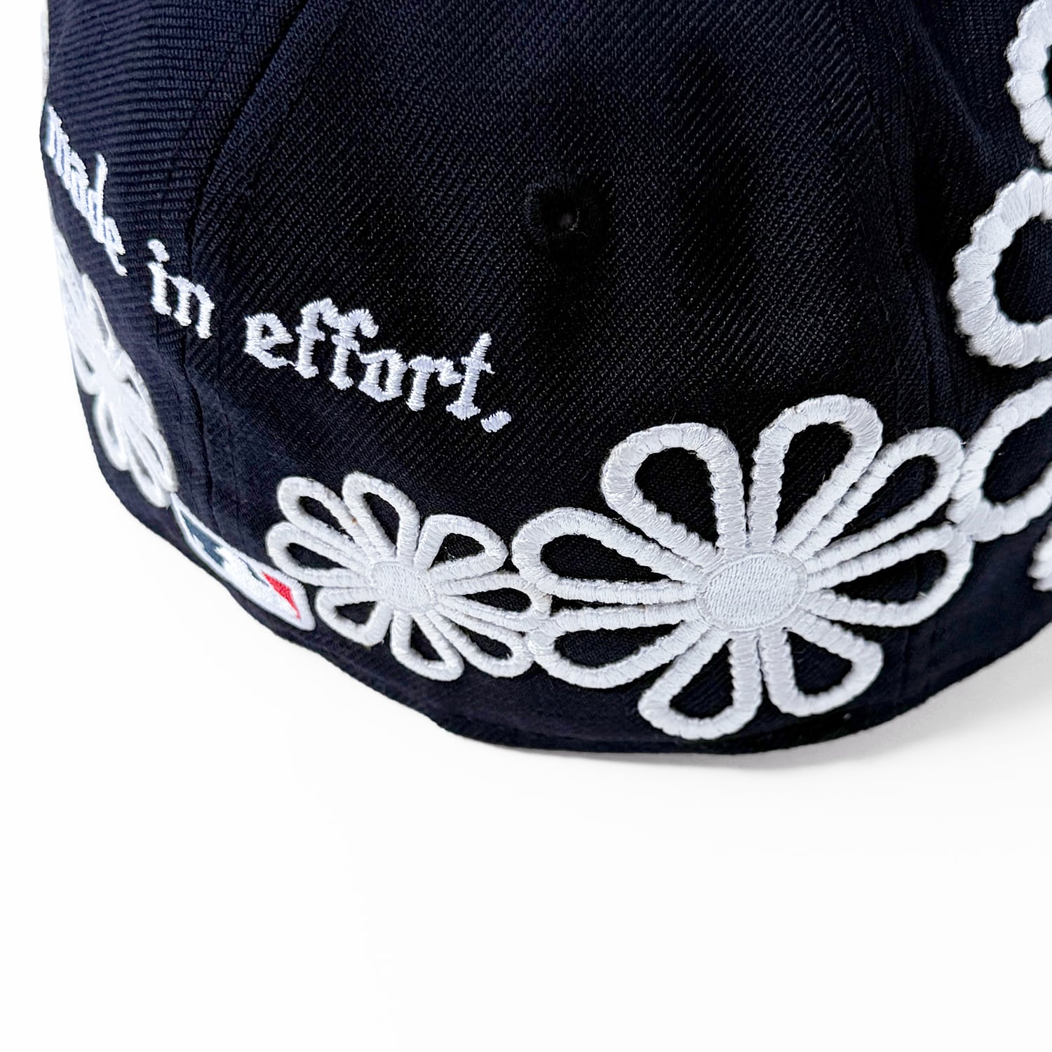 サイドとバックにフラワーデザインの刺繍パッチが施されたカスタムキャップ。