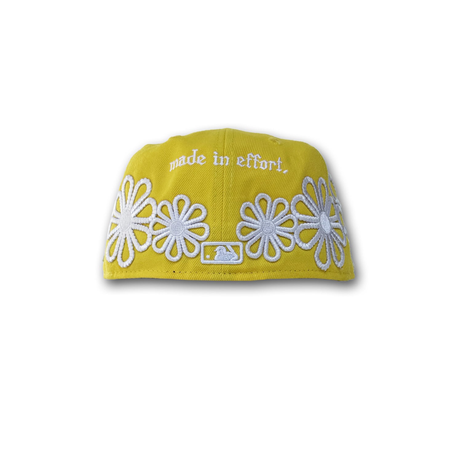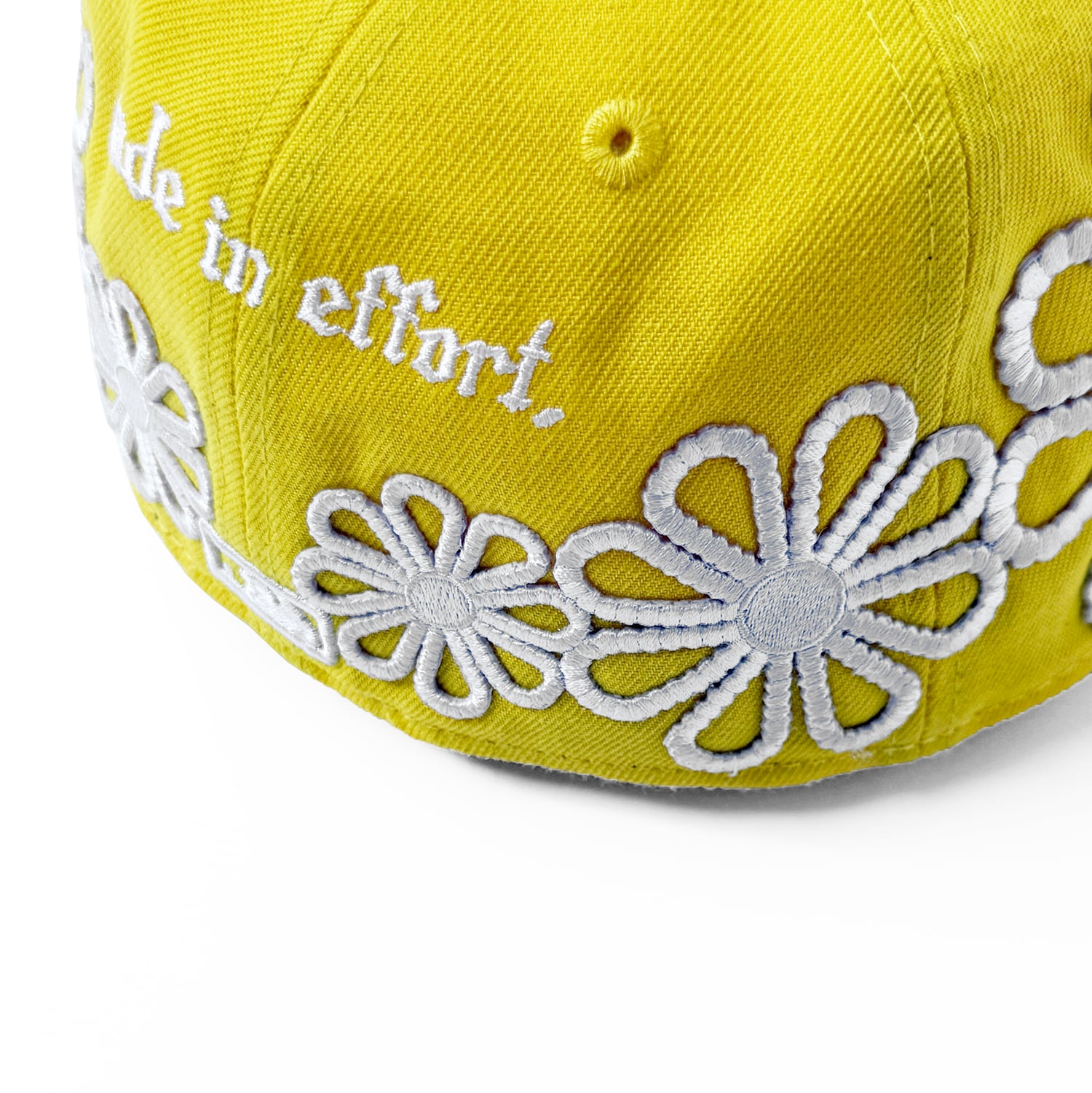 サイドとバックにフラワーデザインの刺繍パッチが施されたカスタムキャップ。