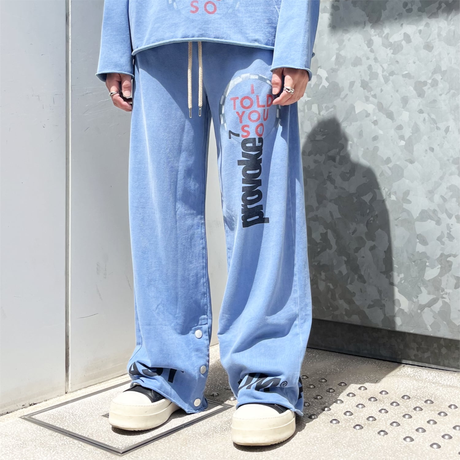 スナップボタンで裾幅の調節が可能で、裾部分はカットオフデザイン。